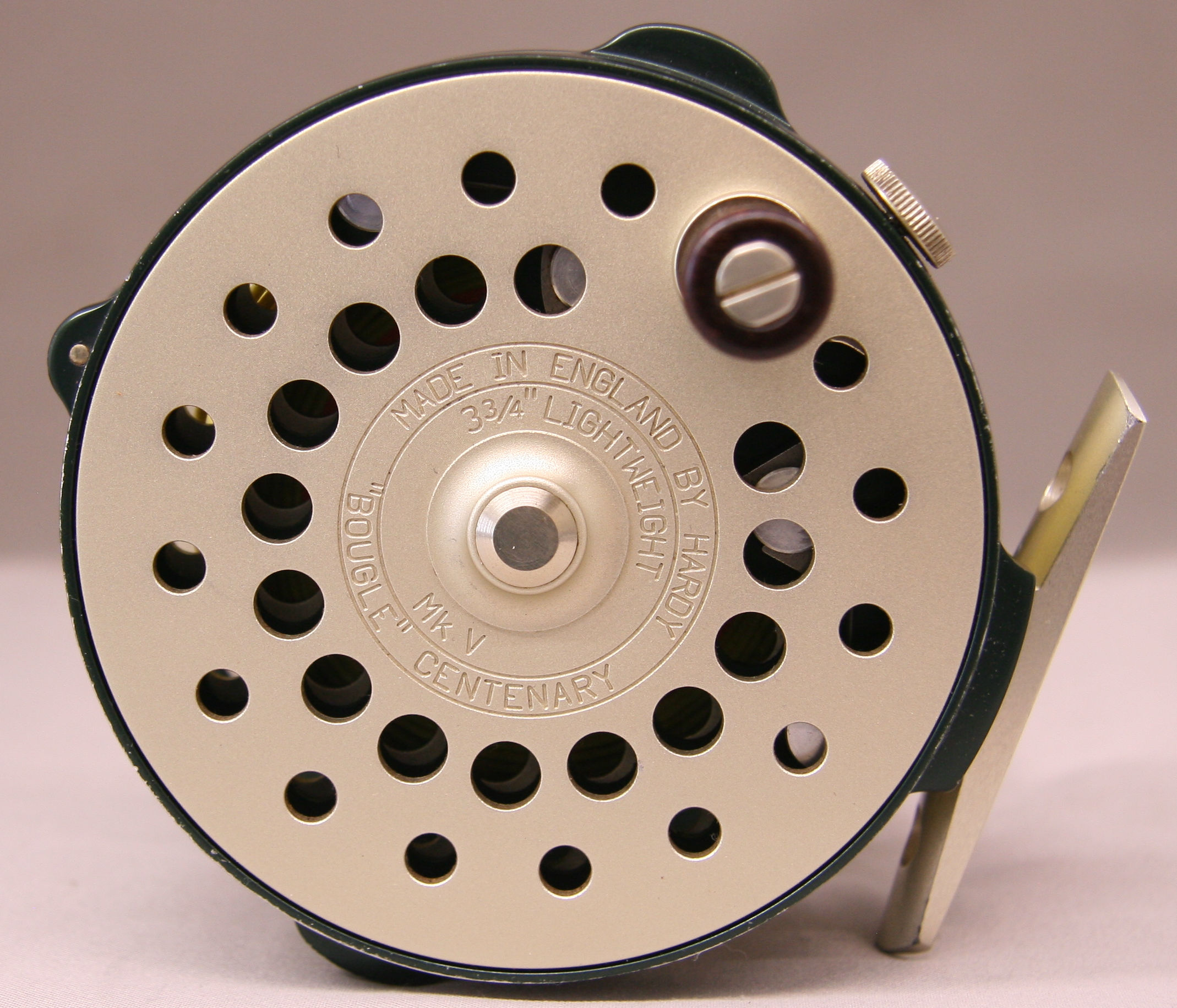 Bougle Centenary MkV. Diameter 3 3/4 inches Lightweight. Serial number A12685. LHW/RHW reversible. Spooled with line and backing. Includes Hardy burgandy pouch. Sound mechanically, with finish rubs.