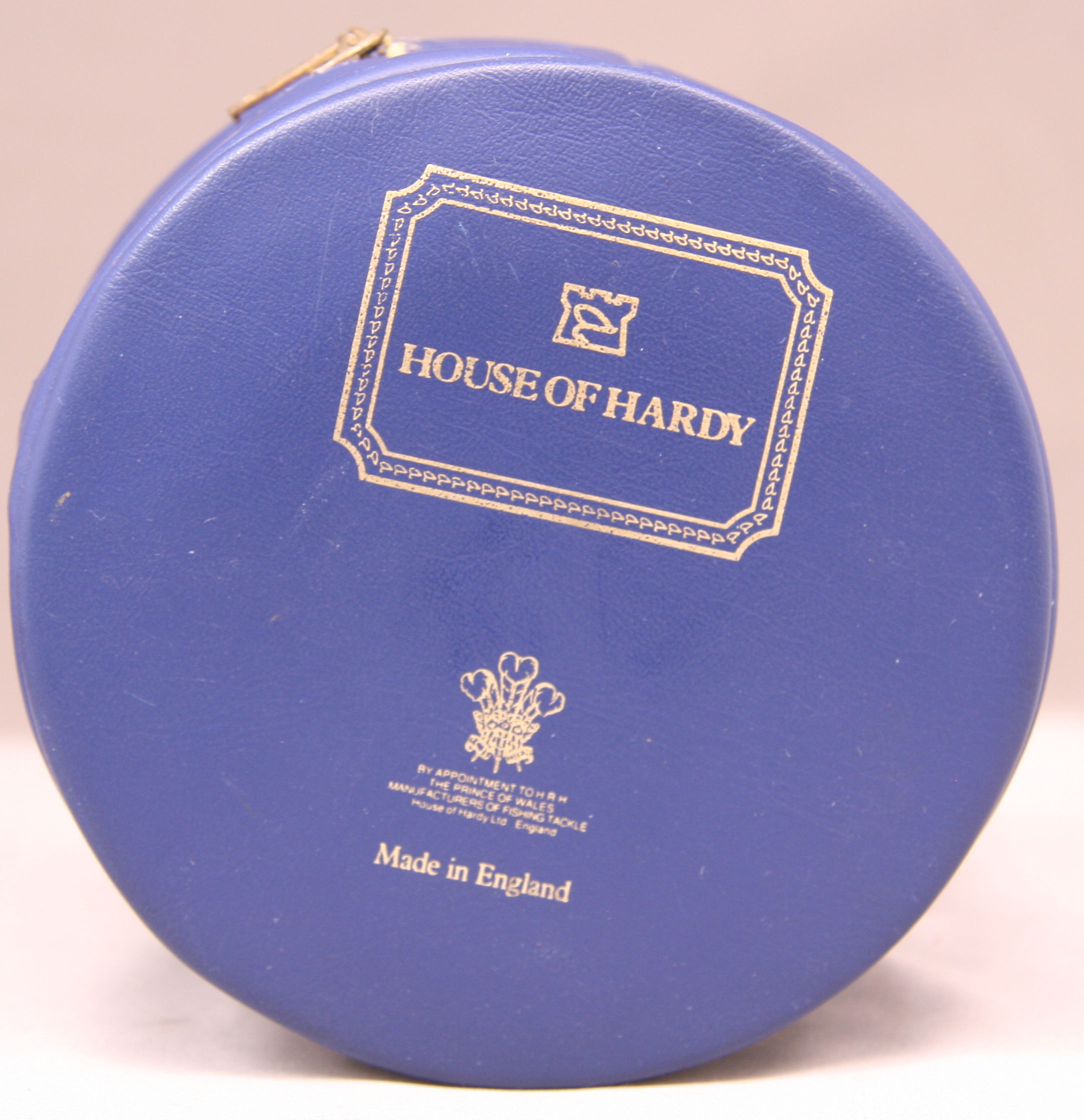 Perfect 3 5/8 inch diameter. Milky agate line guard. Smooth aluminum foot. Black winding knob. RHW. Includes blue vinyl pouch. This reel is lined with backing. Sound mechanically with some finish rubs.