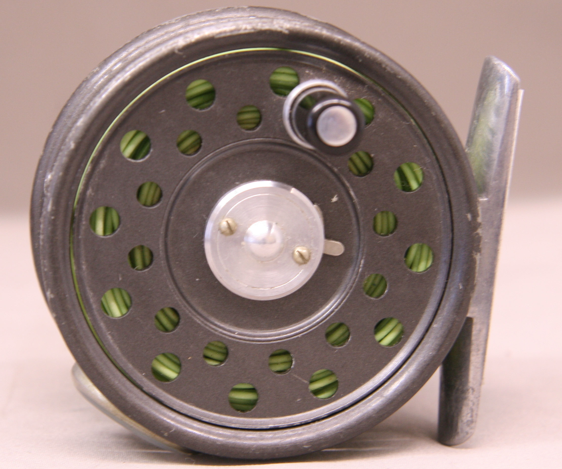 St George 2 9/16 inch diameter.  Line weight 2/3.  RHW. Milky agate line guard. Black handle. Smooth aluminum reel foot. Two screw spool latch cover. Includes original box. Sound mechanically, fair finish.