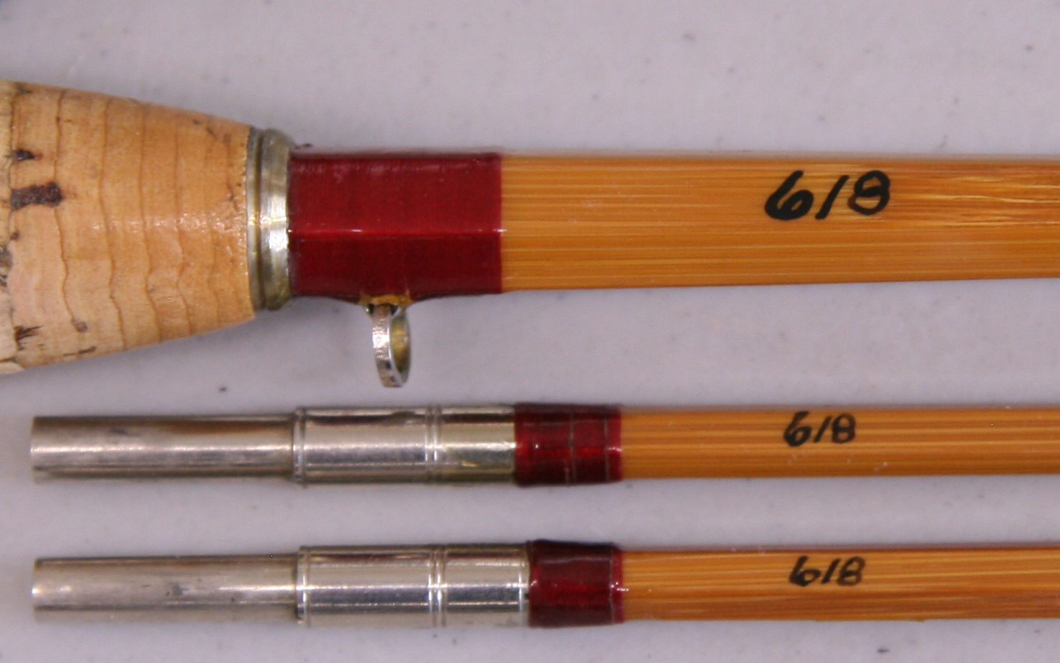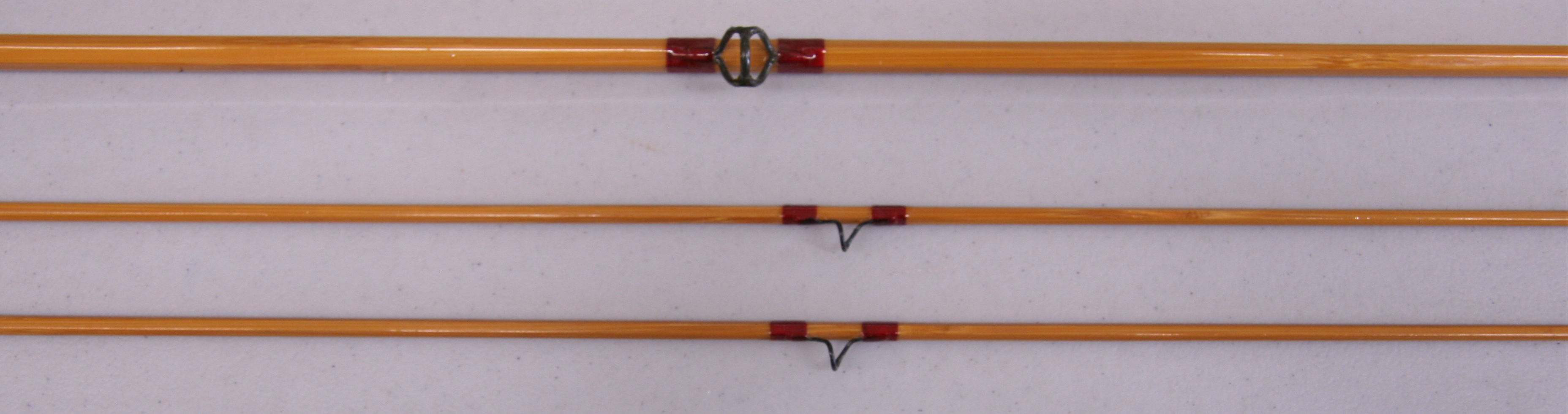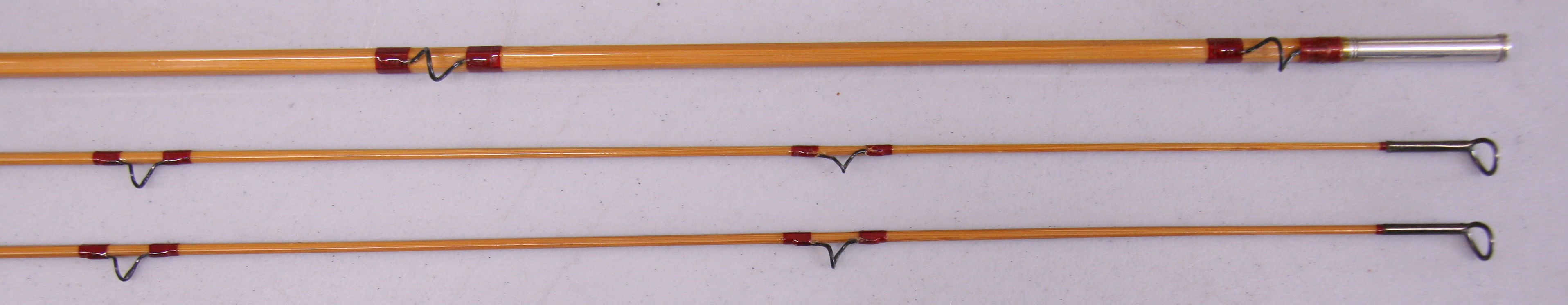 6'6", 2/2 Model 37. Serial number 618.  Line weight DT3. Weighs 2.4 oz on our digital scale.  Cigar cork grip. Down-sliding cap and ring over wood insert reel seat.  Red thread wraps. Nickel silver ferrules size 10. Includes original cloth bag aluminum tube. Although the cane is sound the refinish is only fair with varnish runs and sags.