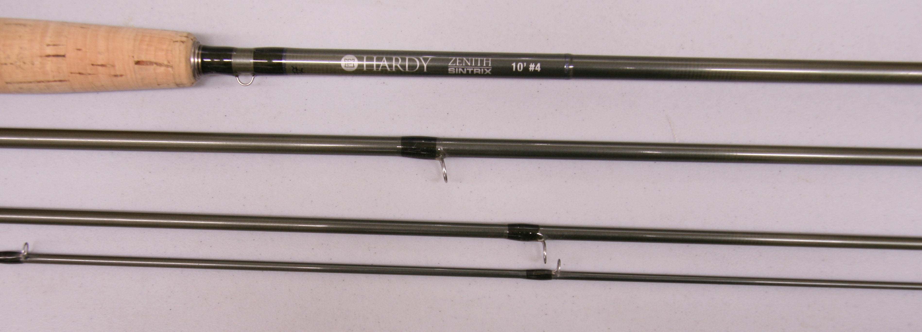 Hardy Zenith Sintrix. Length is 10 feet, 4 piece. Line weight 4.  Reverse half wells cork grip. Up-locking reel seat over wood insert. Includes original bag and tube with cloth tube cover. Very good condition.