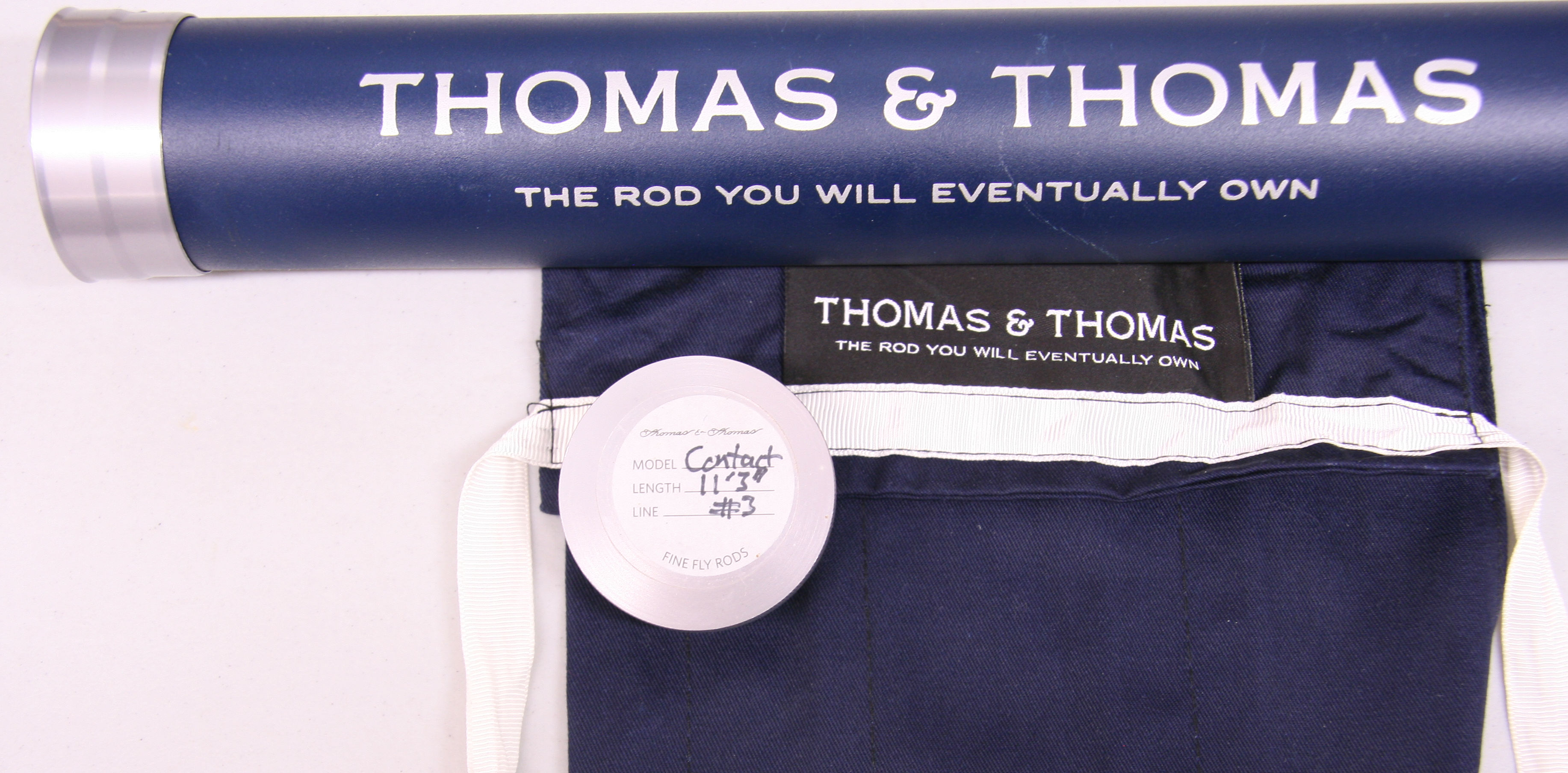 Thomas and Thomas Contact 1144-4  11'3" in length, 4 piece rod. Serial number 144114. Line weight 3. Weighing 3.2 oz. Reverse half wells cork grip. Down locking reel seat with attached fighting butt. Includes original  cloth bag with tag and labeled tube. Very good condition.