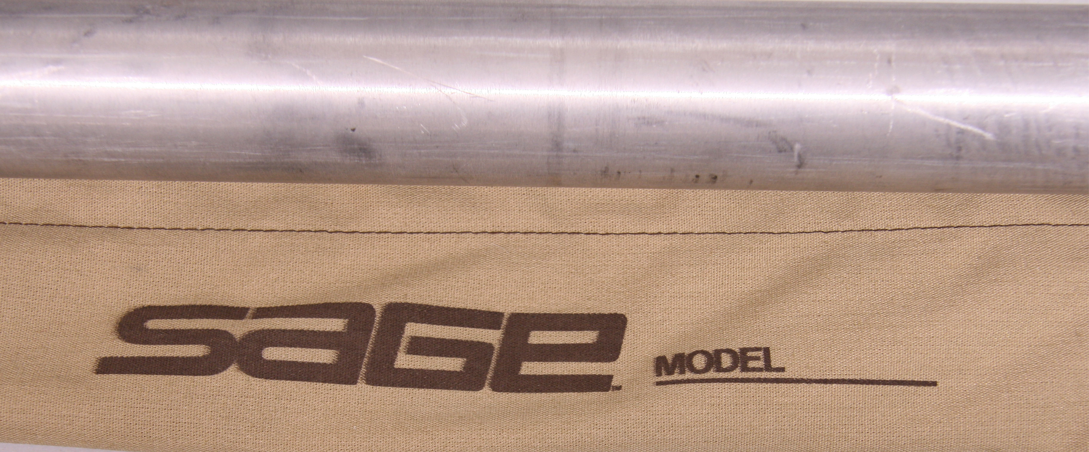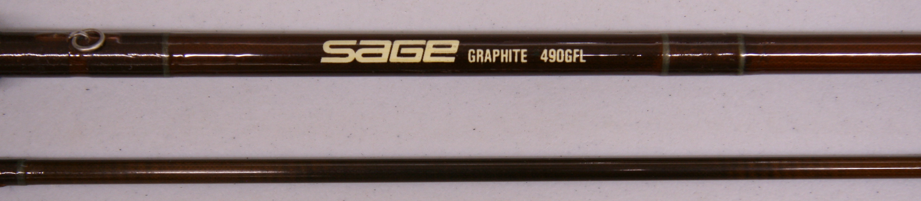 Sage model 490 GFL, 9', 2 piece, 4 line weight. Half wells cork grip. Up-locking reel seat over wood insert. Butt section has 2 carbide stripper guides. Includes original bag and tube. Very good condition.
