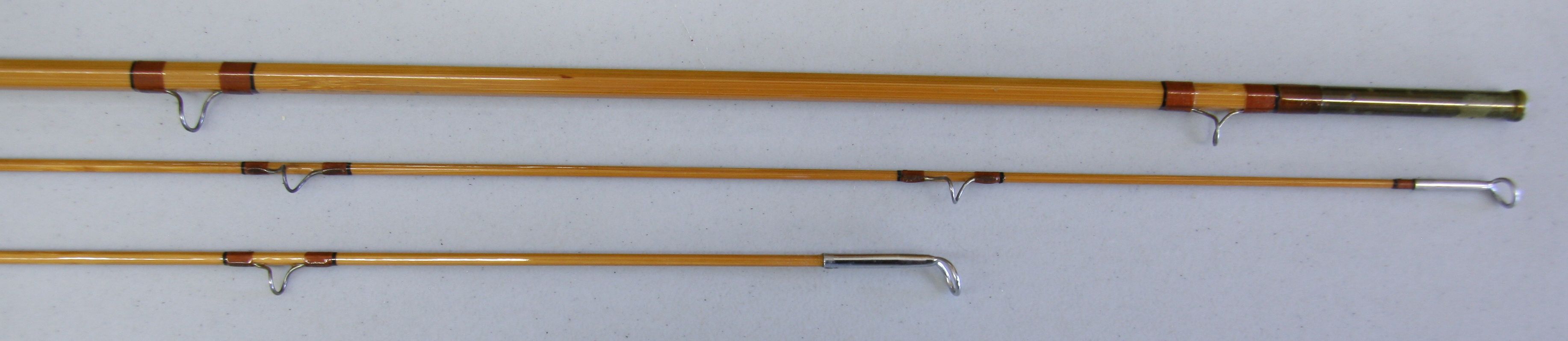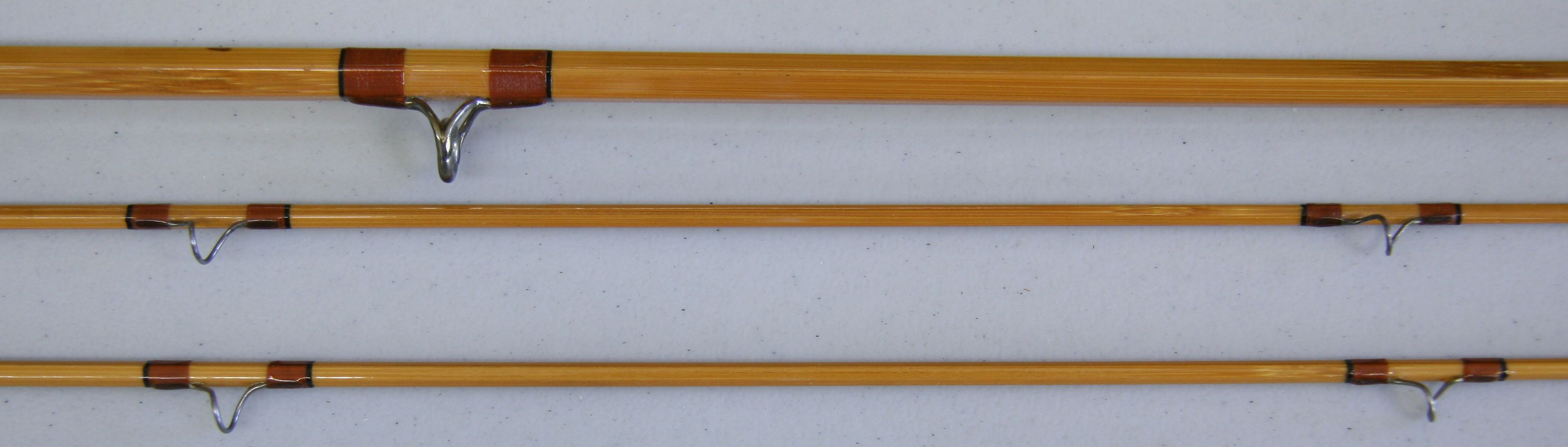 7'6", 2/2 Model 7612 Special  There were 29 7612 rods in Dickerson's ledger.  The rod weighs 3.4 oz.. on our digital scale. Line weight 4. Reverse half wells cork grip with down-locking aluminum hardware over walnut wood insert reel seat. Blued nickel silver ferrules size 12. Rust brown colored silk wraps tipped in black. The cloth bag is probably original and replacement aluminum tube. Excellent condition, possibly an indication of an excellent restoration. The original owner's name, Ed Sxxxx 1953 is inscribed on the blank. One tip section is 4 1/2 inches short. The short tip can be scarfed. Ask for details.  sold