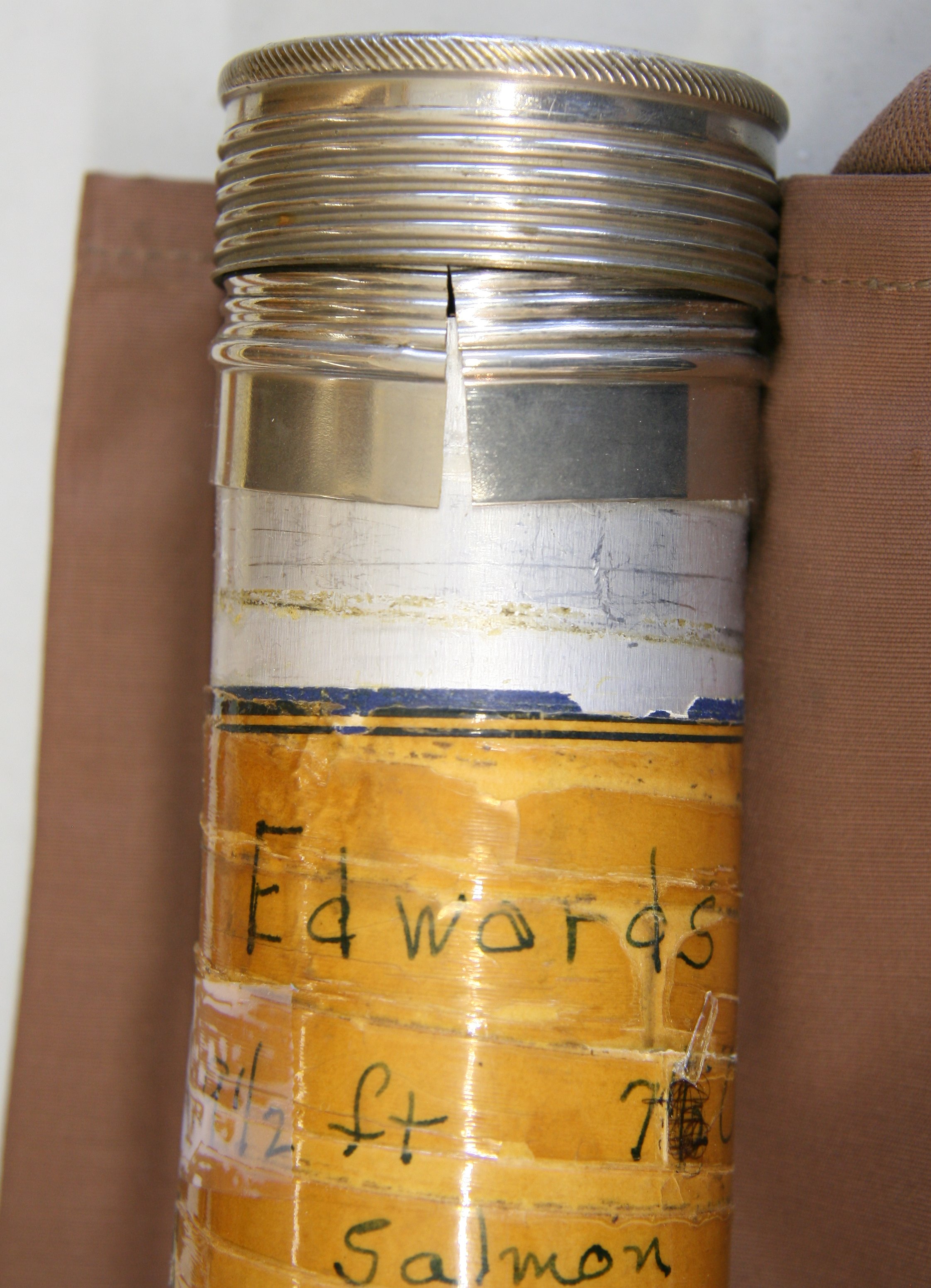 9'6", 3/2 De Luxe salmon rod. Reverse half wells cork grip. Up-locking aluminum hardware over wood insert reel seat. Weighing 7 oz. Line weight 7/8. Although the bag has a slot for a fighting butt, it is missing. The cane is sound as are most of the wraps. However, a few wraps are in need of varnish.   1930's rod. sold