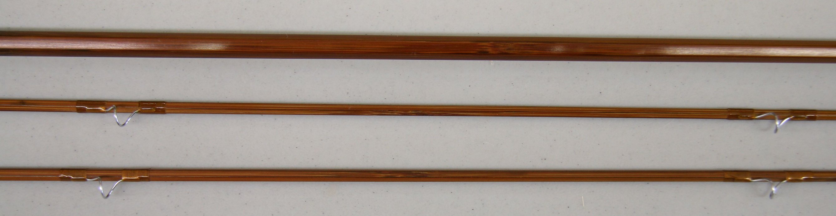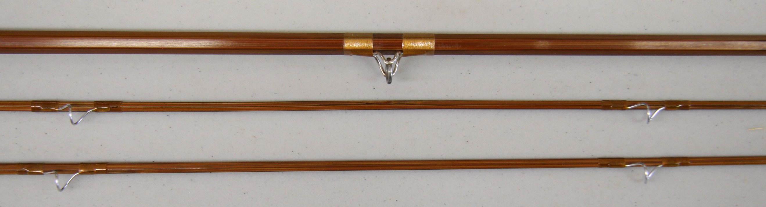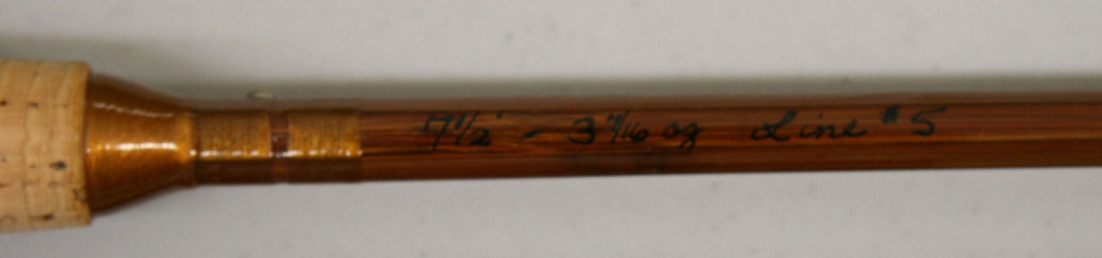 7'6", 2/2 Peerless impregnated.  Line weight 5. Weighing 3 7/16 oz.  Cigar cork grip. Down-locking no rock aluminum reel seat. Thread wraps are Belding Turf Tan Nymo #1248. Nickel silver ferrules size 13. Carbide stripping guide. Includes a Dave Collyer sewn cloth bag and replacement aluminum tube. Excellent condition. This rod was restored by Denver Dave Collyer. sold