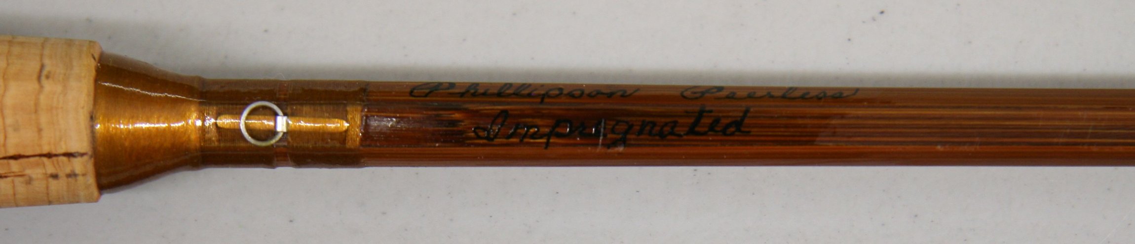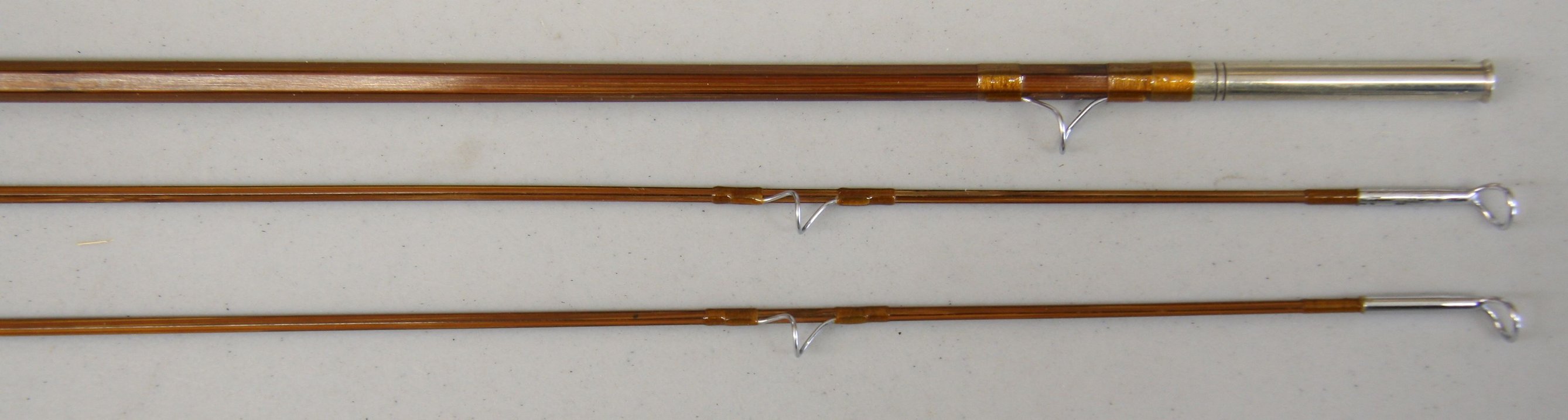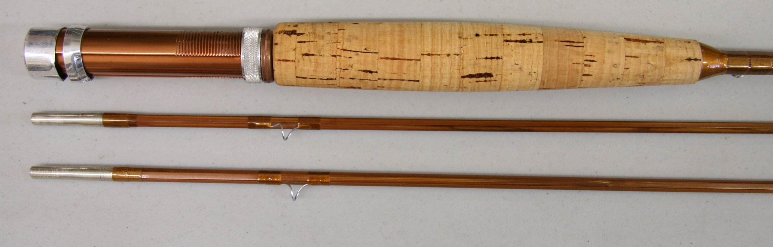 7'6", 2/2 Peerless impregnated.  Line weight 5. Weighing 3 7/16 oz.  Cigar cork grip. Down-locking no rock aluminum reel seat. Thread wraps are Belding Turf Tan Nymo #1248. Nickel silver ferrules size 13. Carbide stripping guide. Includes a Dave Collyer sewn cloth bag and replacement aluminum tube. Excellent condition. This rod was restored by Denver Dave Collyer. sold
