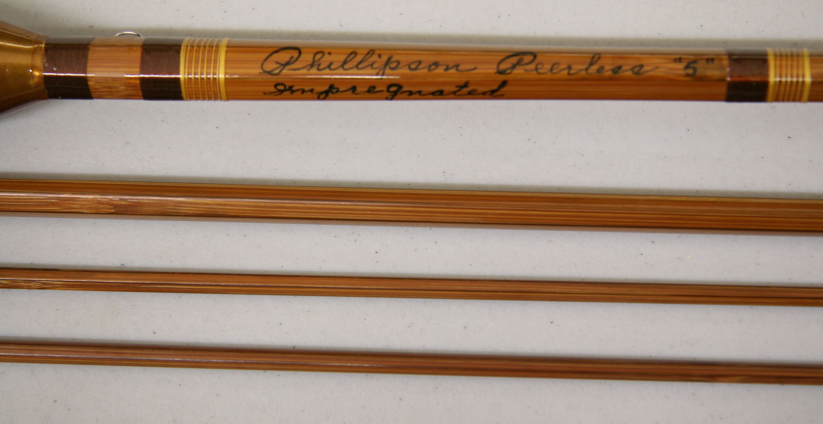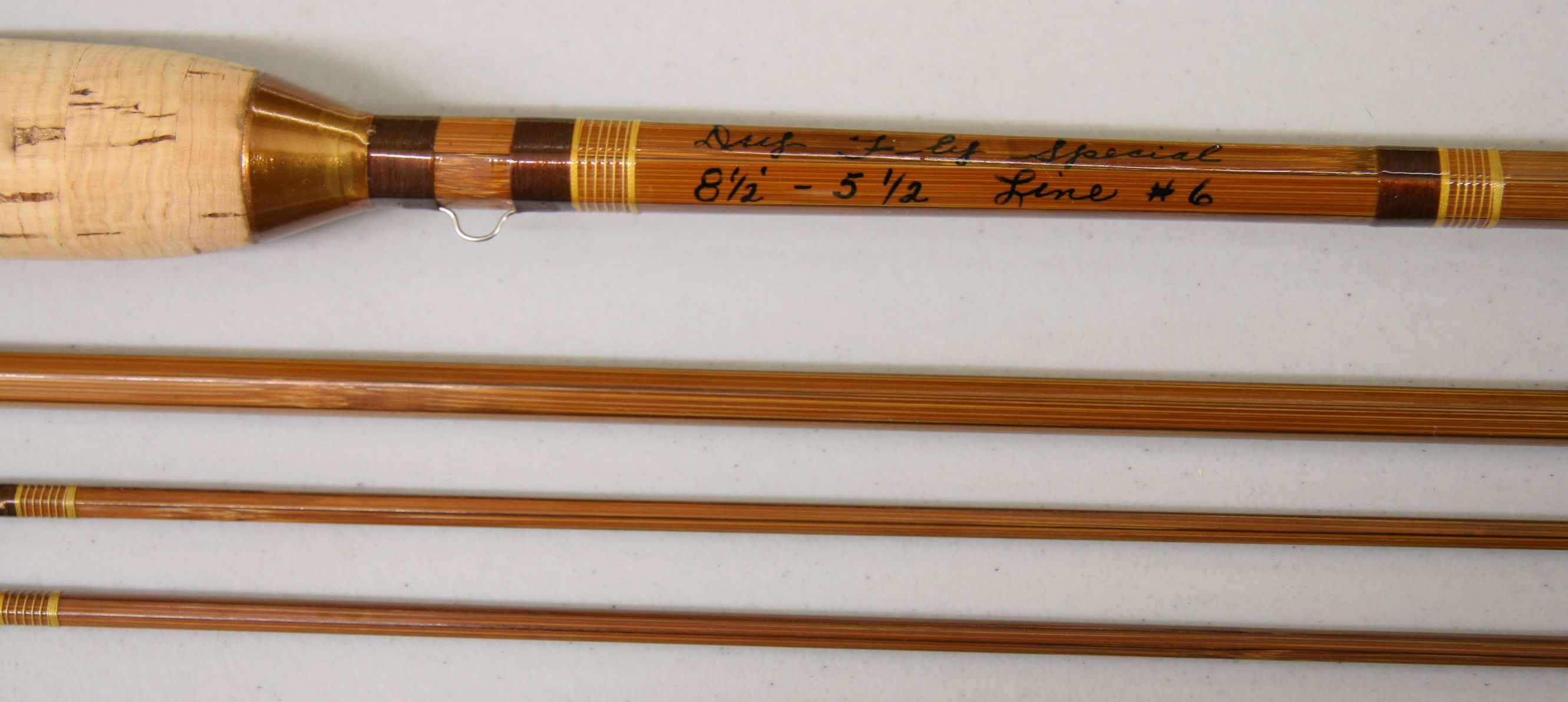 8'6", 3/2 Peerless Dry Fly Special. Line weight 6. Weighing 5.5 oz. Torpedo cork grip. Down-locking no rock reel seat. Thread wraps are Nymo Henna #1224. Nickel silver ferrules sizes 12 and 18. Includes original cloth bag and aluminum tube. Very good condition. sold