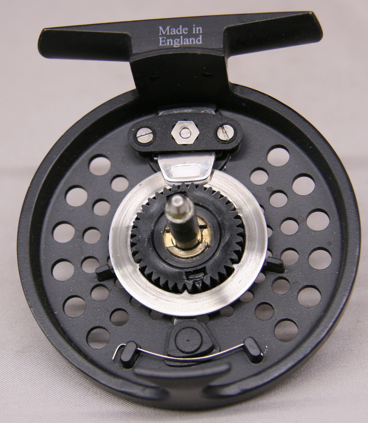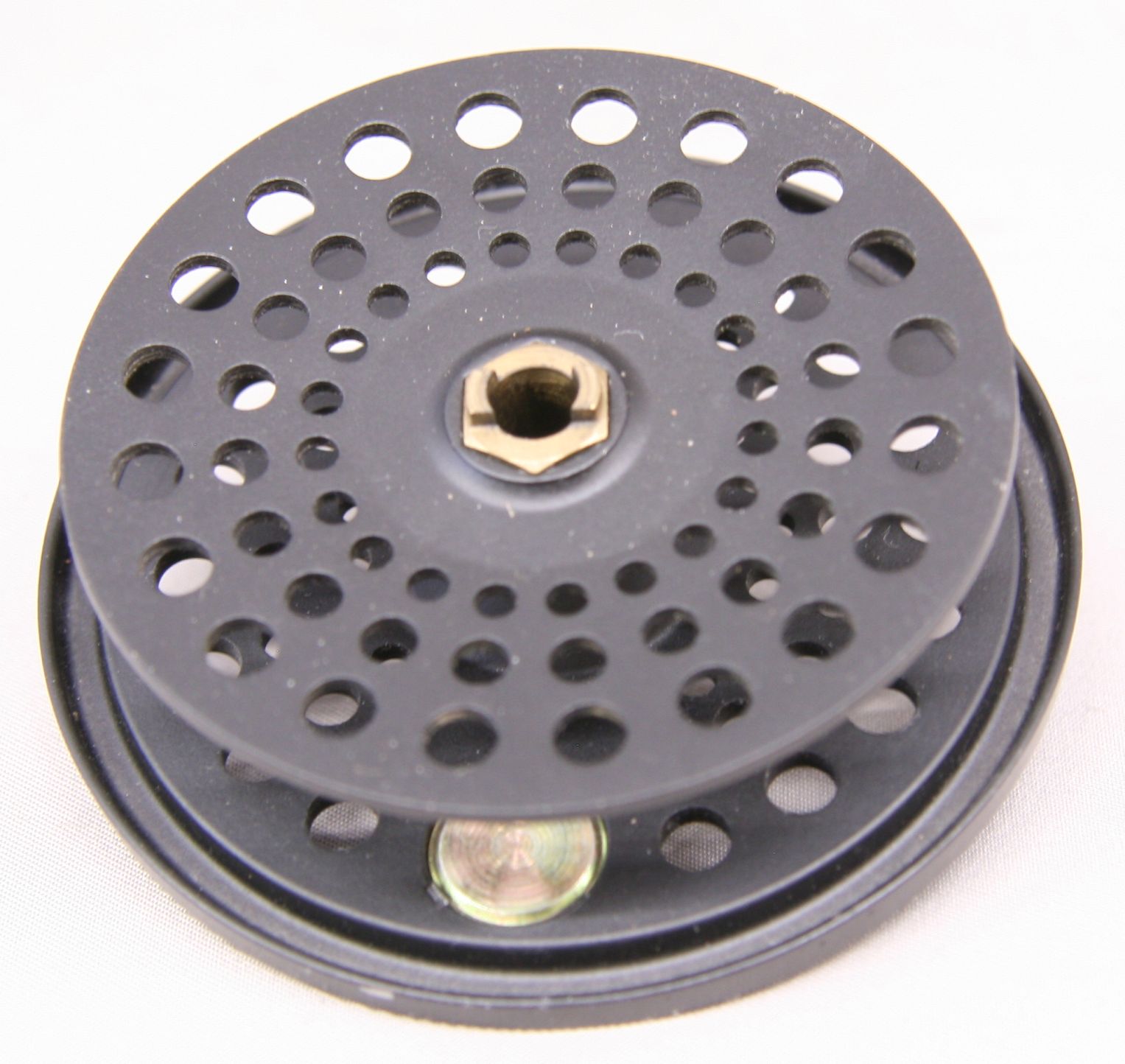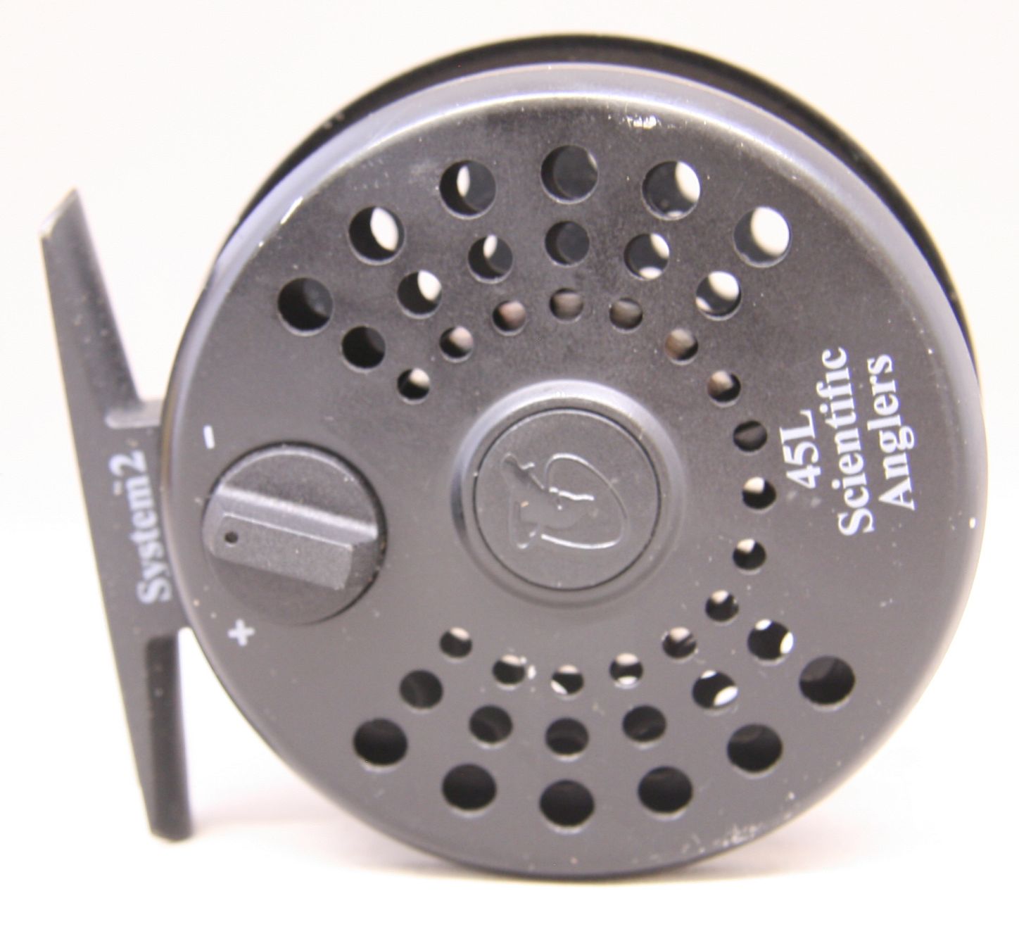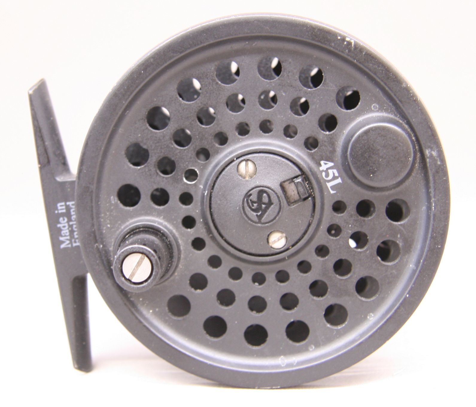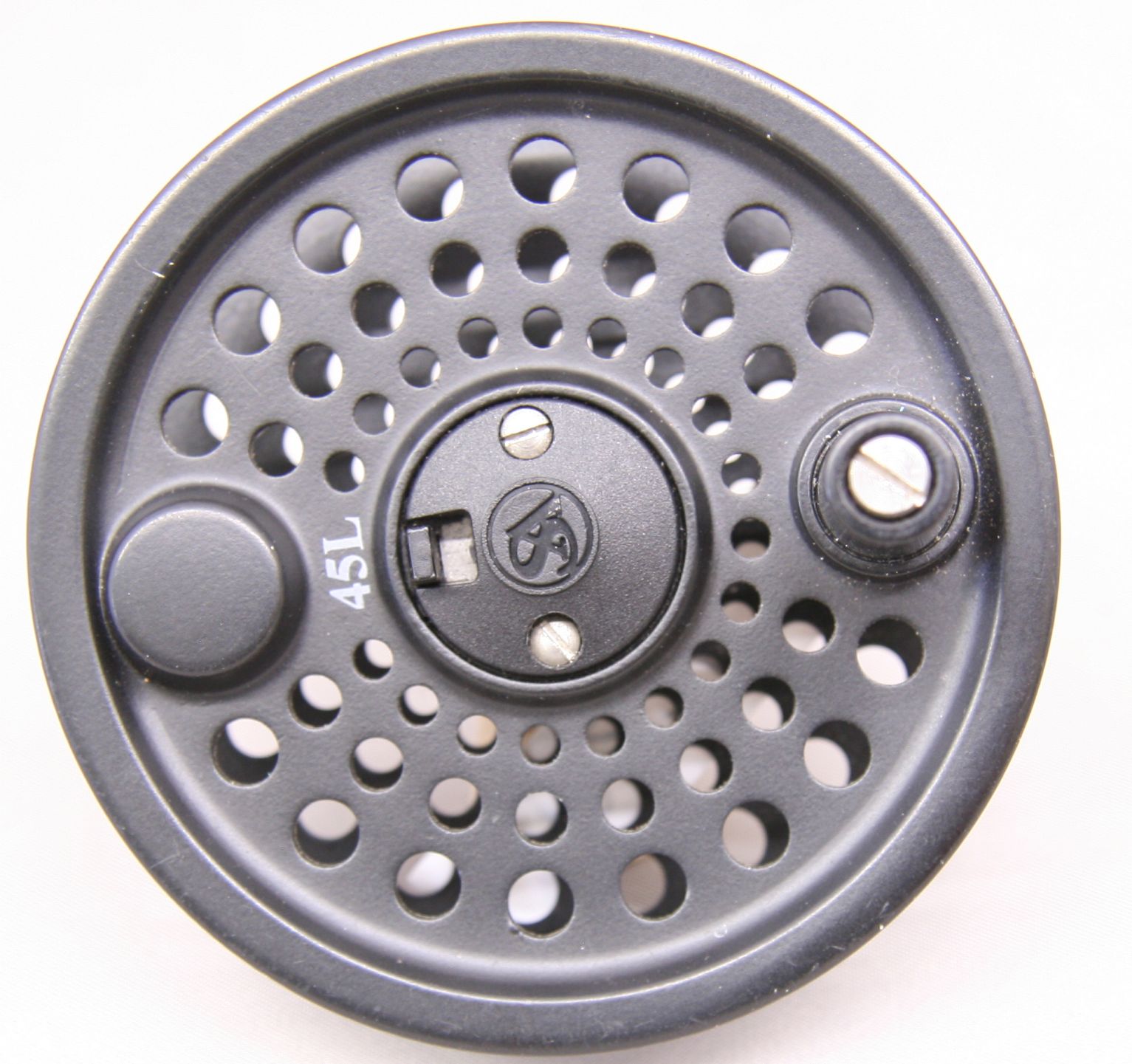 System 2 45L fly reel and spare spool made in England. Line weights 4/5. LHW/RHW reversible. Includes pig suede pouch which holds both reel and spare spool. Very good condition with minor surface scuffs. sold