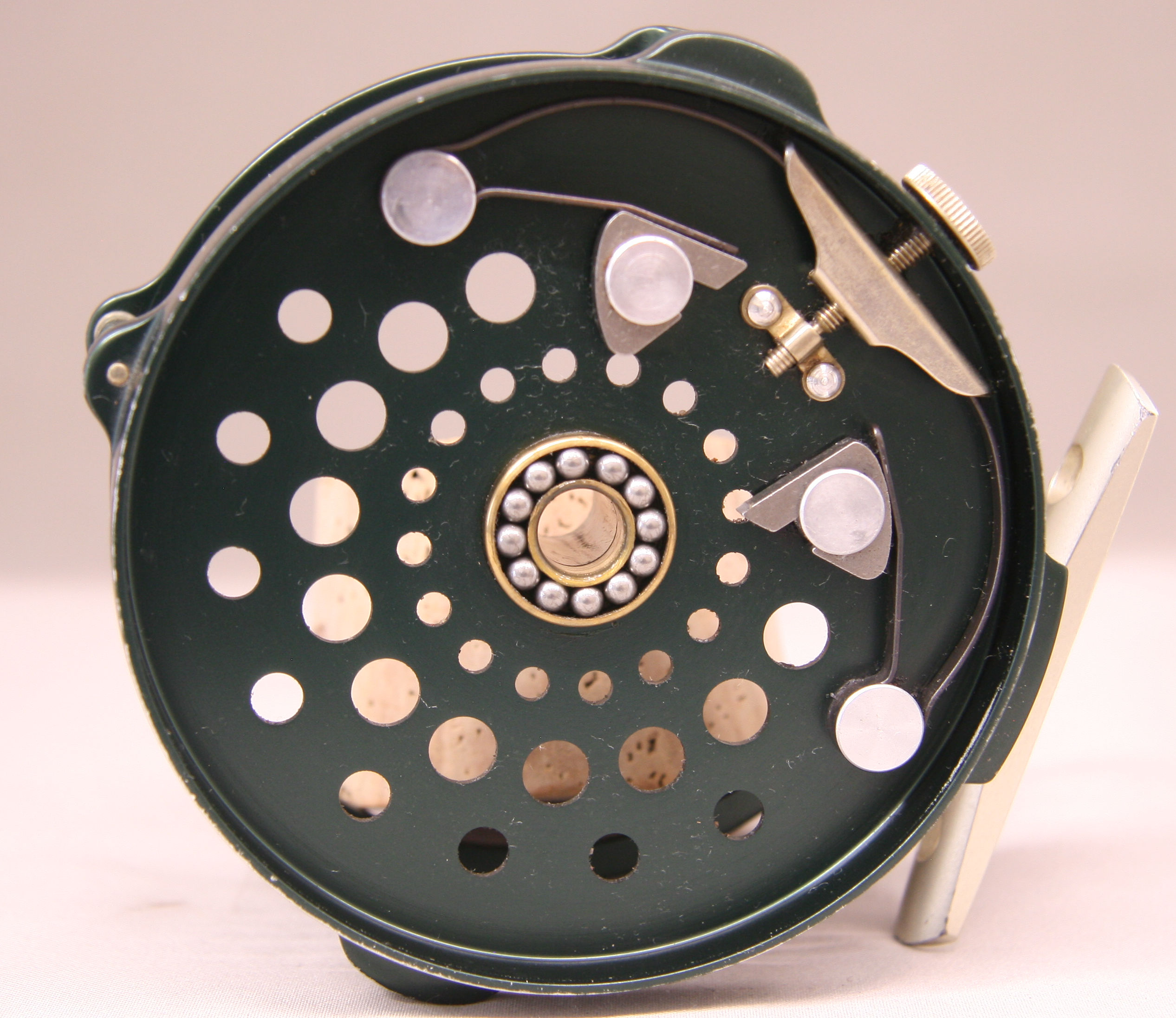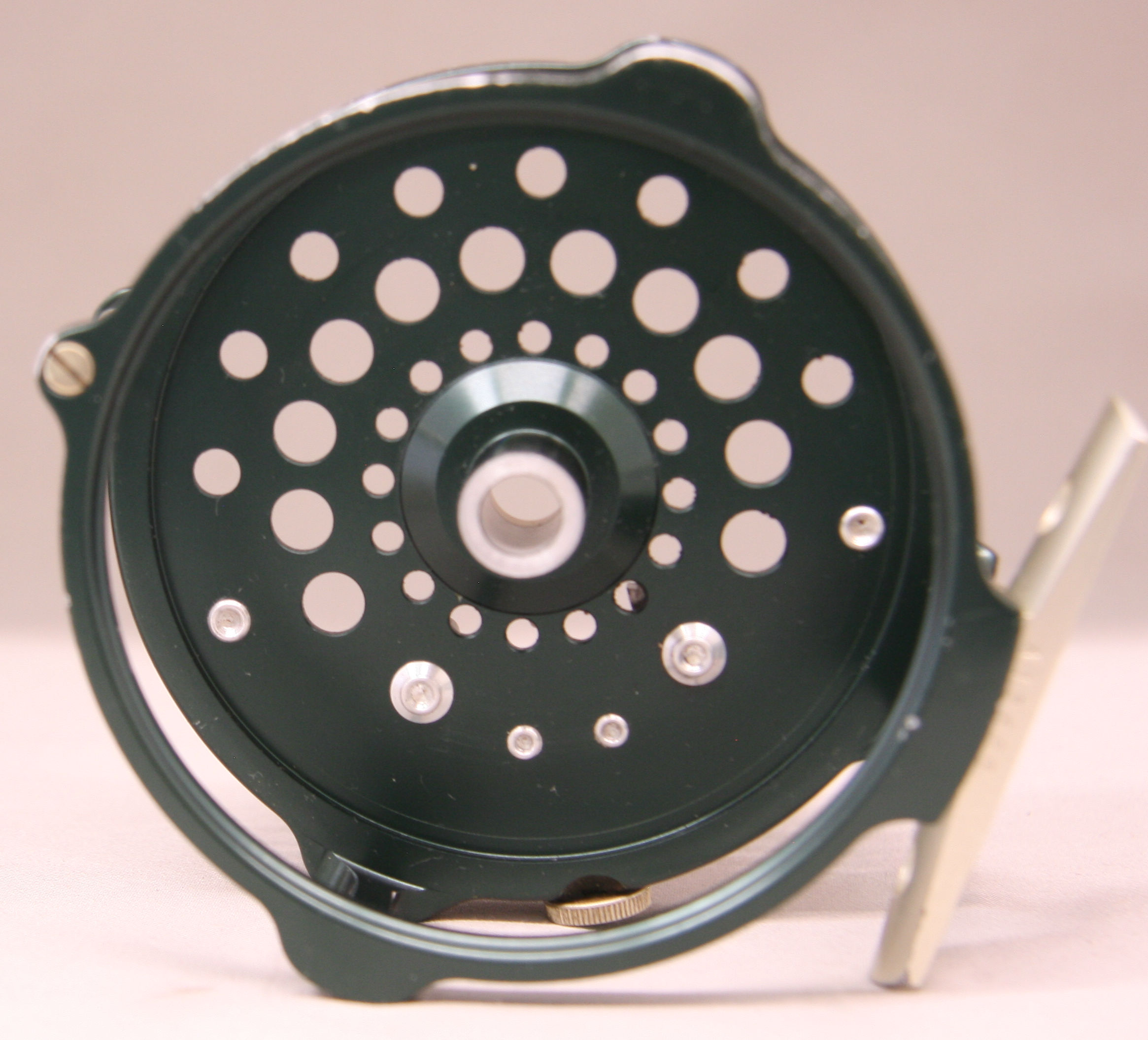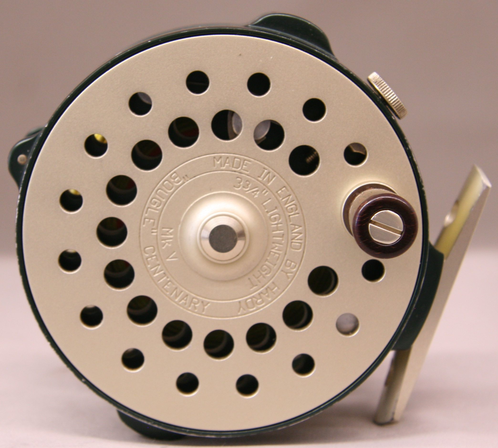 Bougle Centenary MkV. Diameter 3 3/4 inches Lightweight. Serial number A12685. LHW/RHW reversible. Spooled with line and backing. Includes Hardy burgandy pouch. Sound mechanically, with finish rubs.