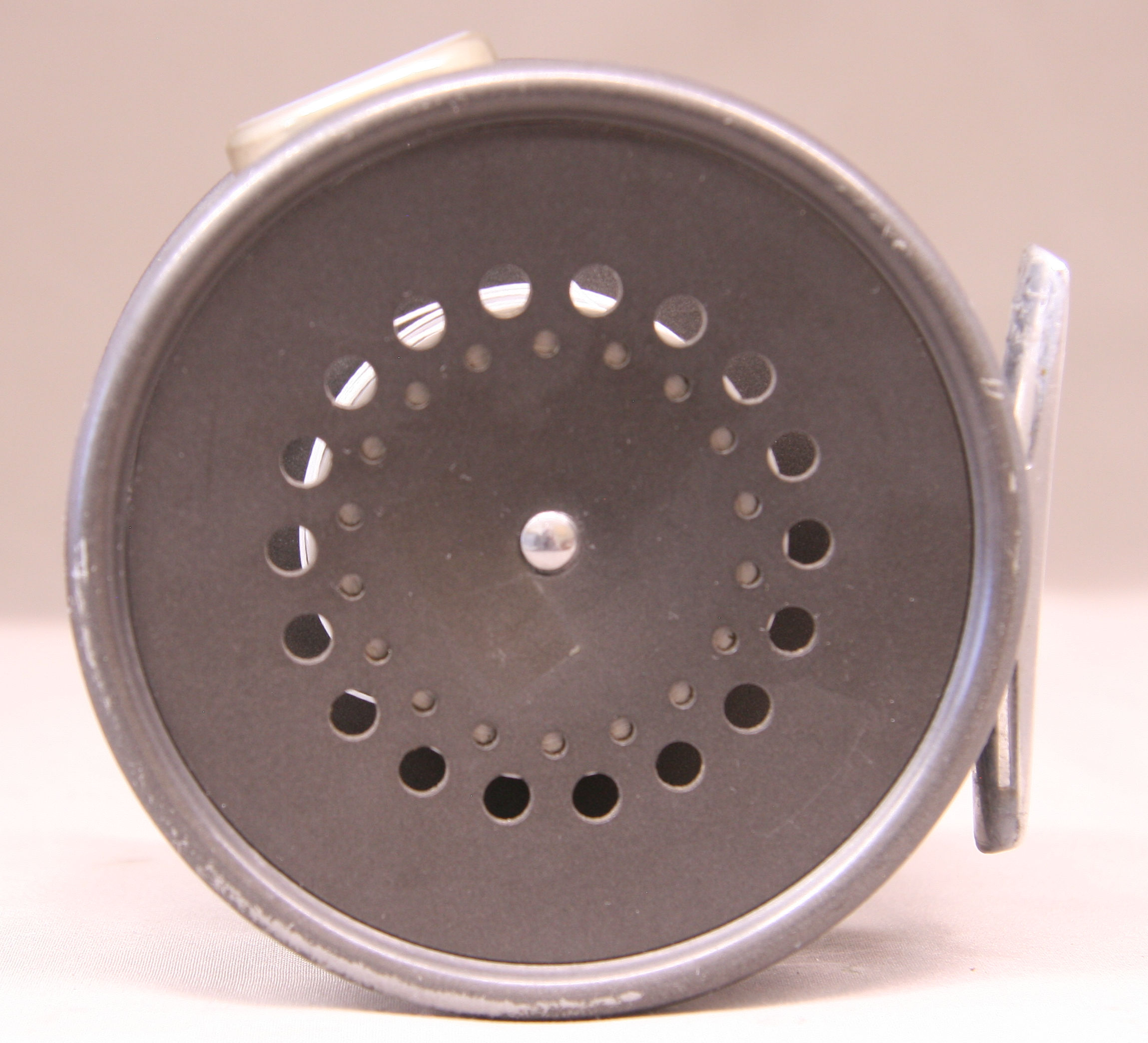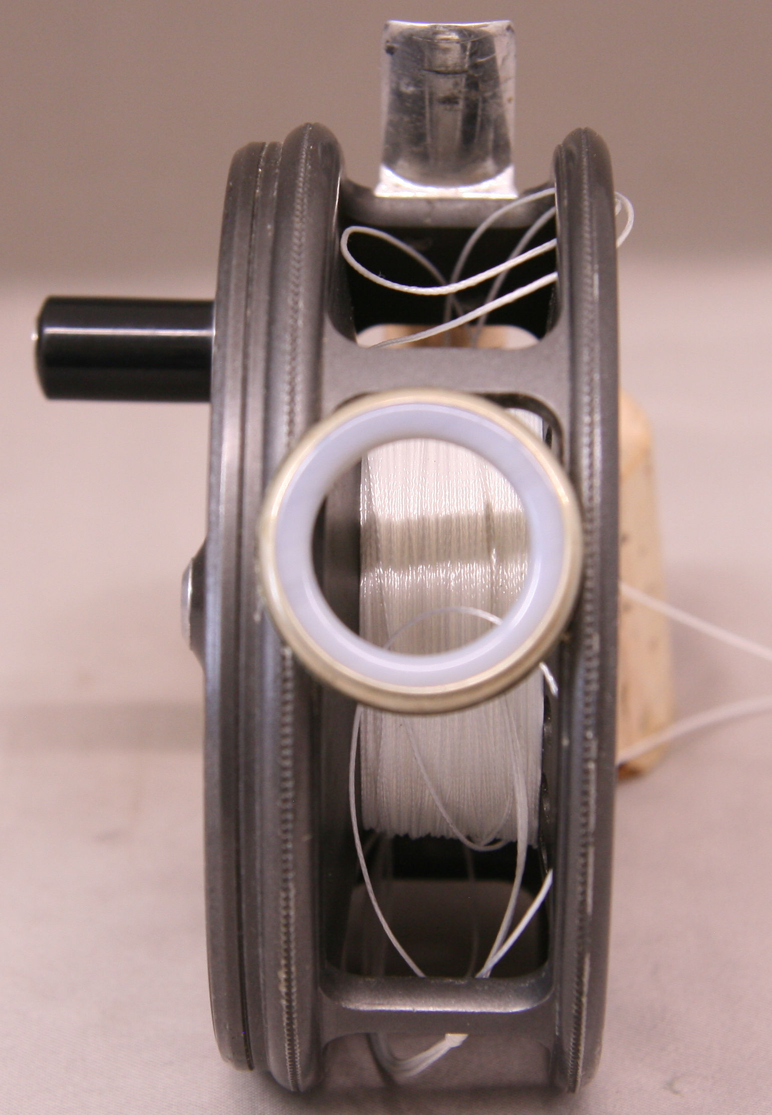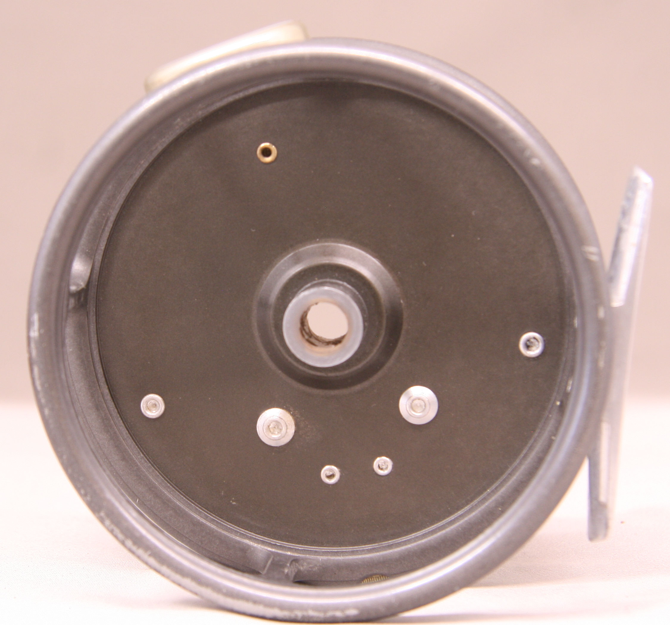 Perfect 3 5/8 inch diameter. Milky agate line guard. Smooth aluminum foot. Black winding knob. RHW. Includes blue vinyl pouch. This reel is lined with backing. Sound mechanically with some finish rubs.