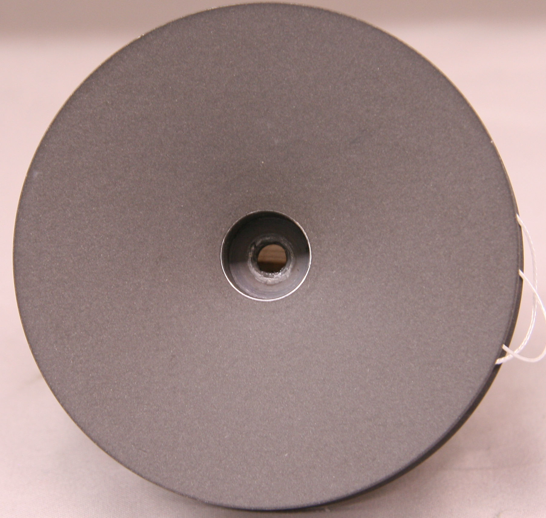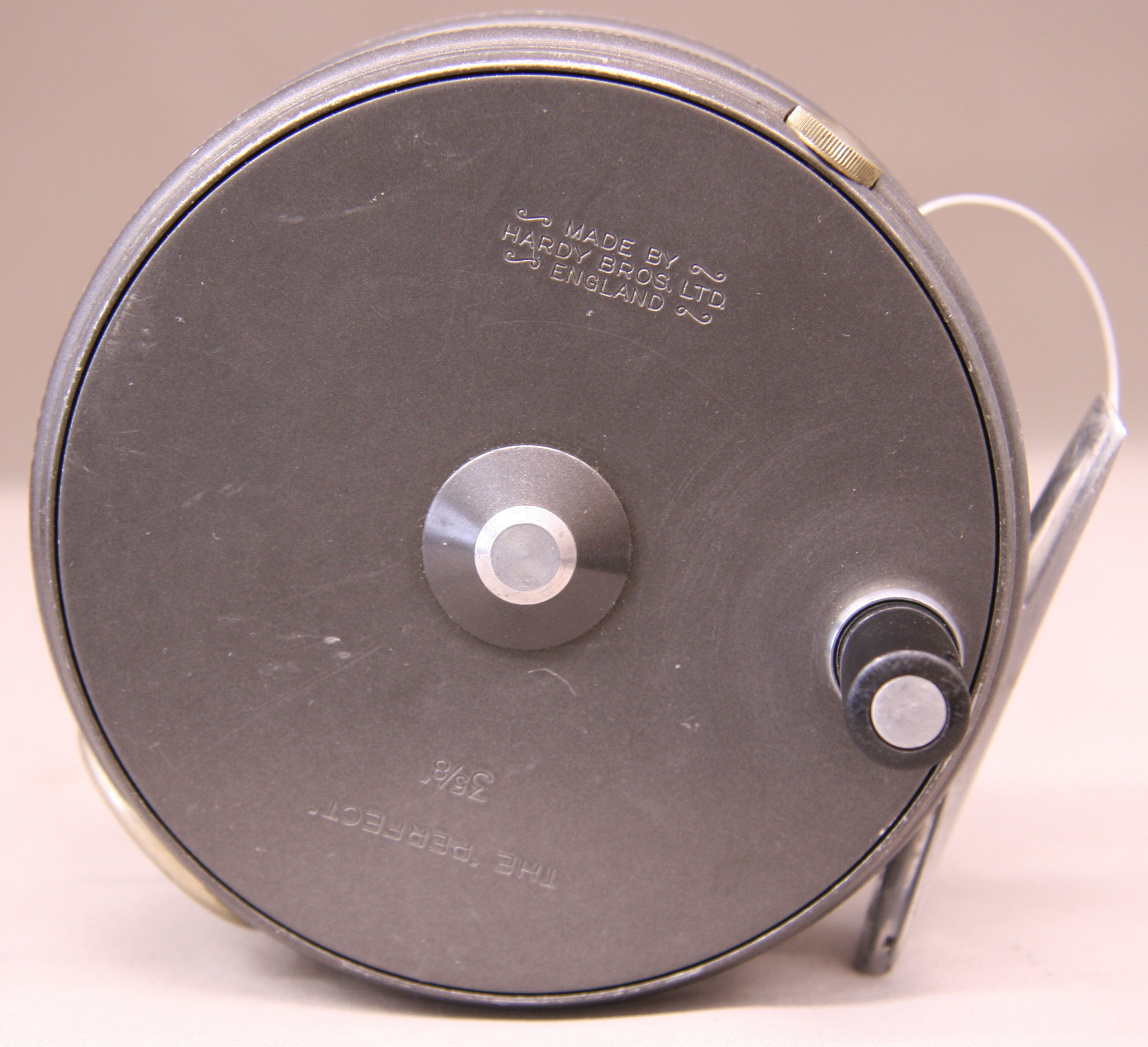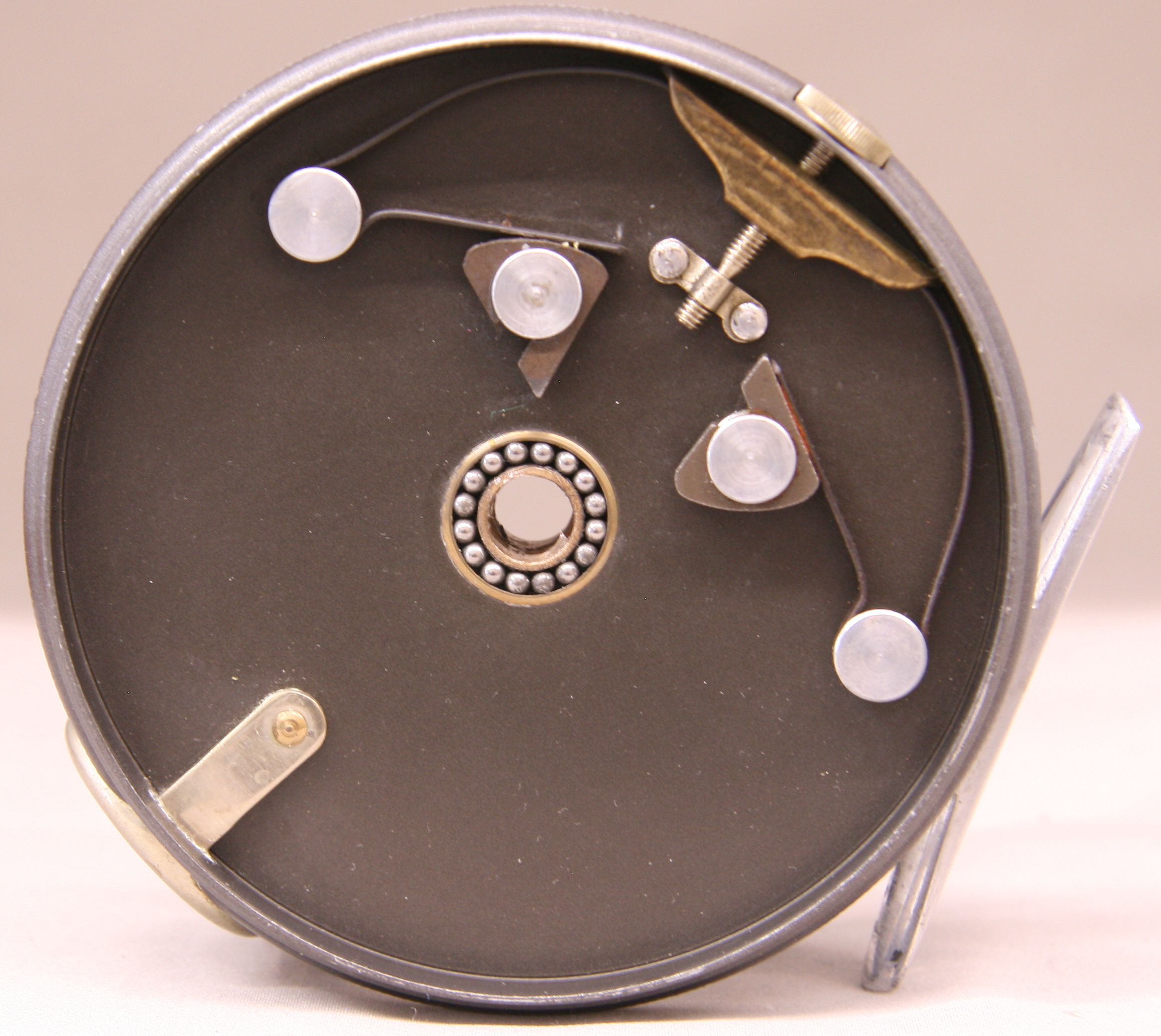 Perfect 3 5/8 inch diameter. Milky agate line guard. Smooth aluminum foot. Black winding knob. RHW. Includes blue vinyl pouch. This reel is lined with backing. Sound mechanically with some finish rubs.