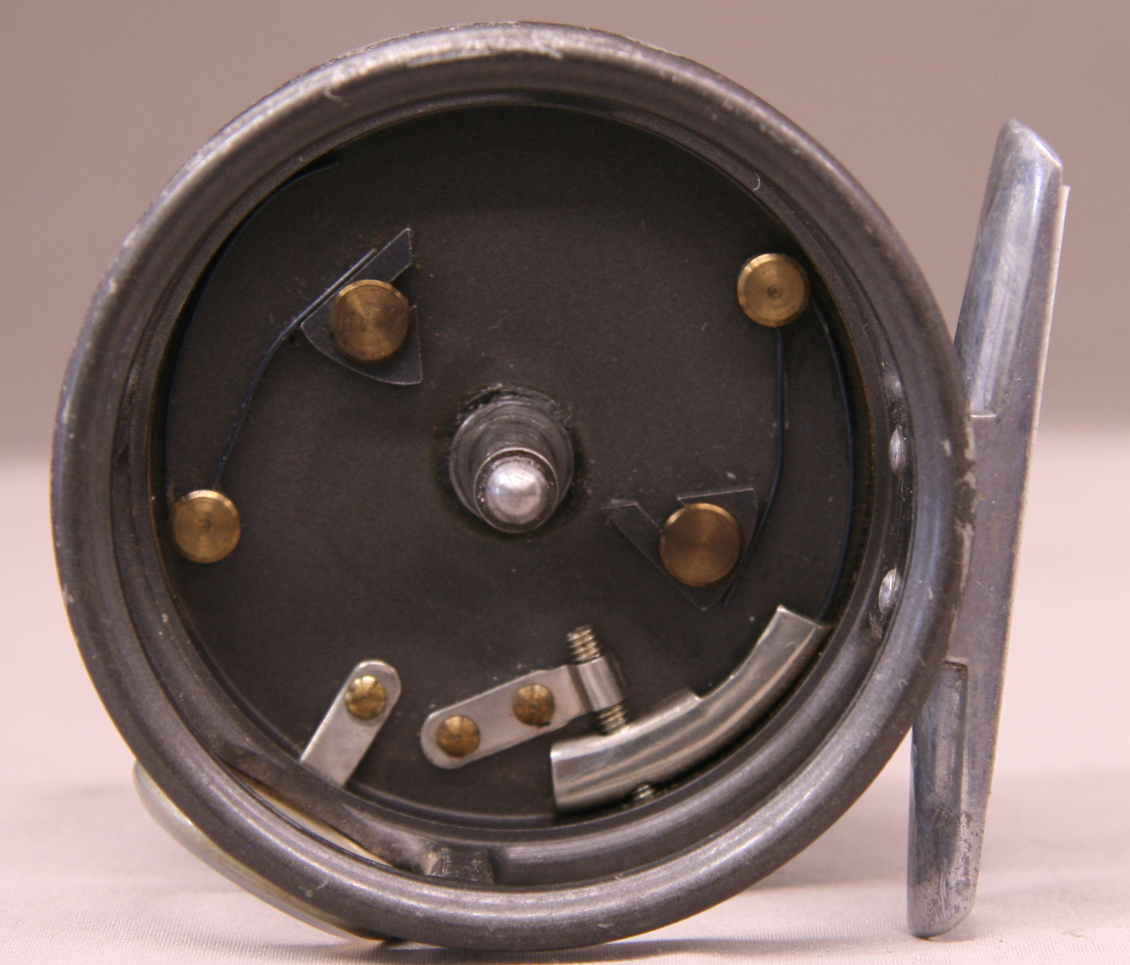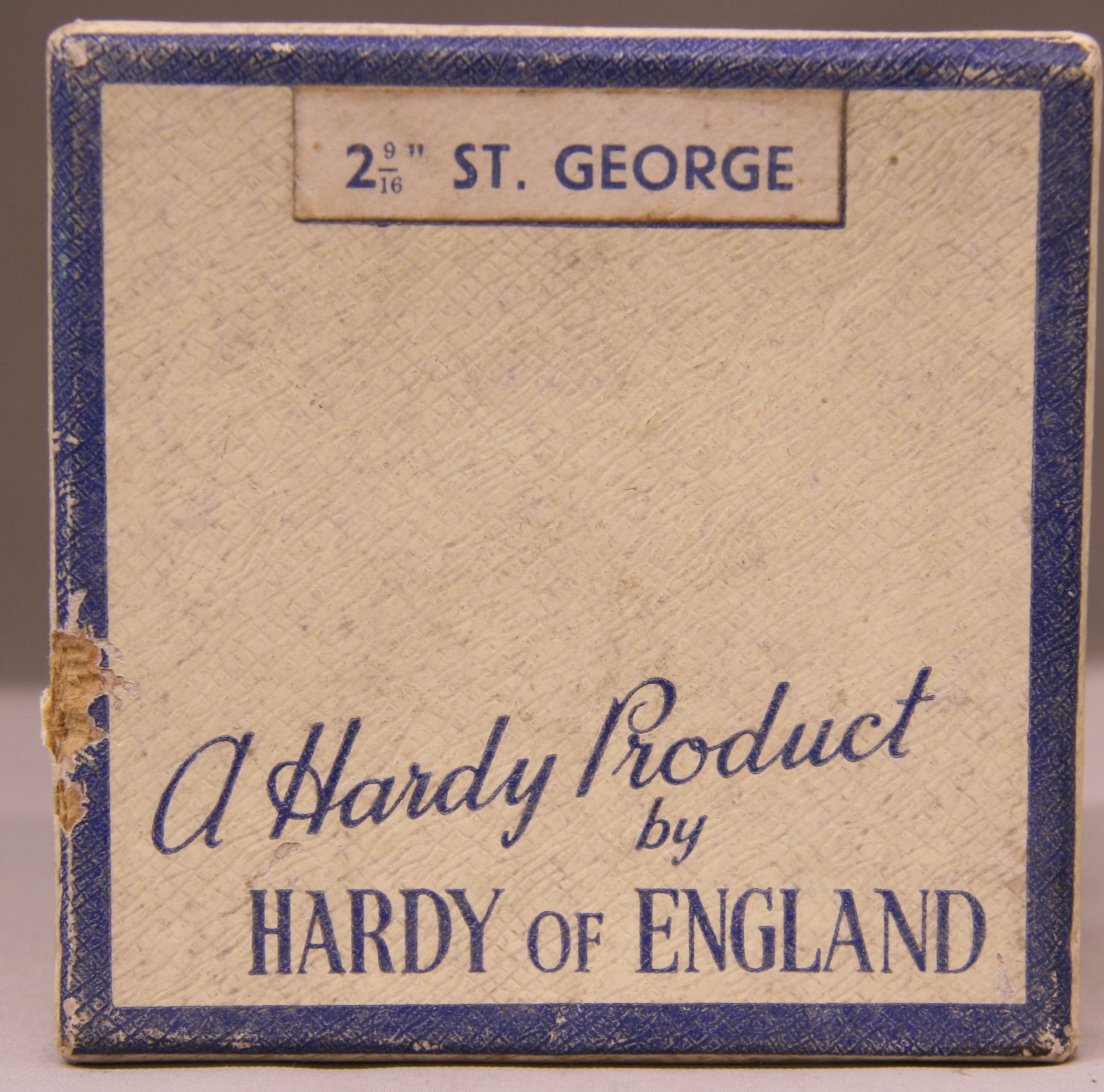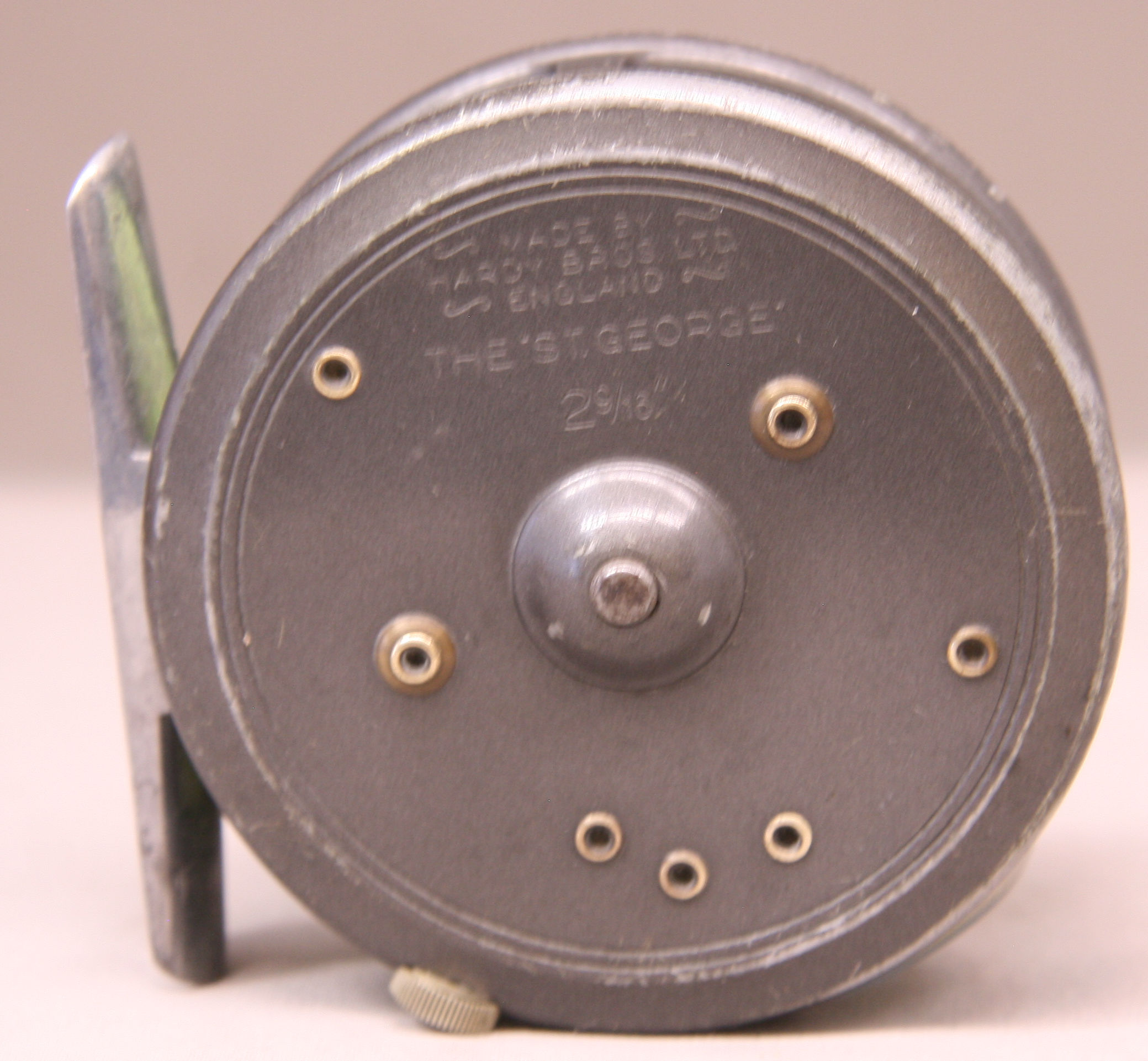 St George 2 9/16 inch diameter.  Line weight 2/3.  RHW. Milky agate line guard. Black handle. Smooth aluminum reel foot. Two screw spool latch cover. Includes original box. Sound mechanically, fair finish.