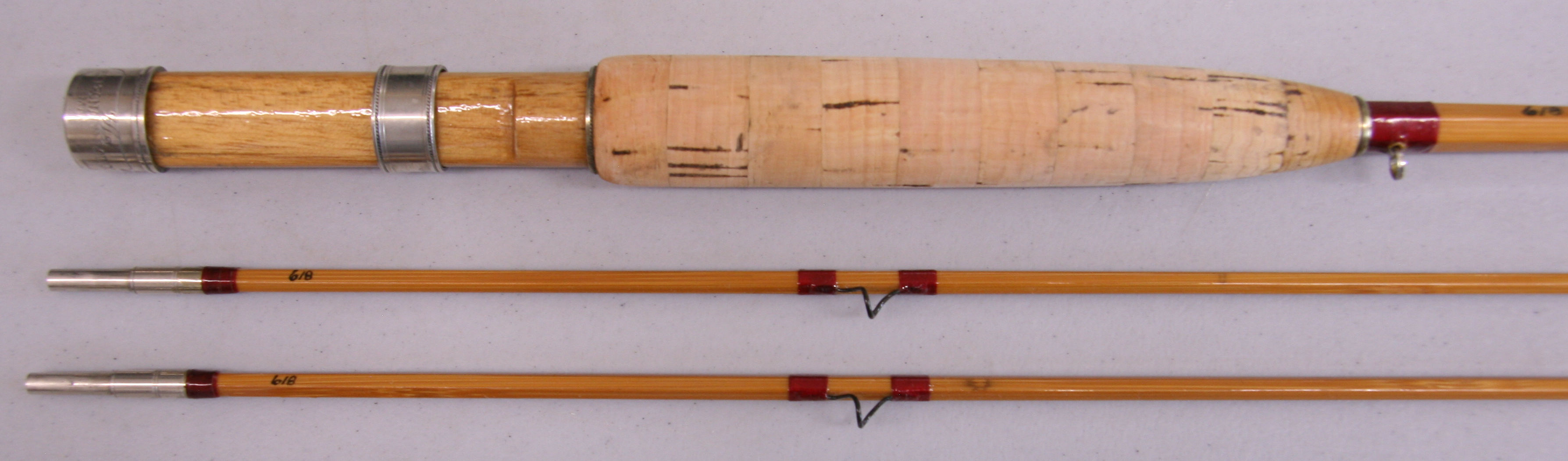 6'6", 2/2 Model 37. Serial number 618.  Line weight DT3. Weighs 2.4 oz on our digital scale.  Cigar cork grip. Down-sliding cap and ring over wood insert reel seat.  Red thread wraps. Nickel silver ferrules size 10. Includes original cloth bag aluminum tube. Although the cane is sound the refinish is only fair with varnish runs and sags.