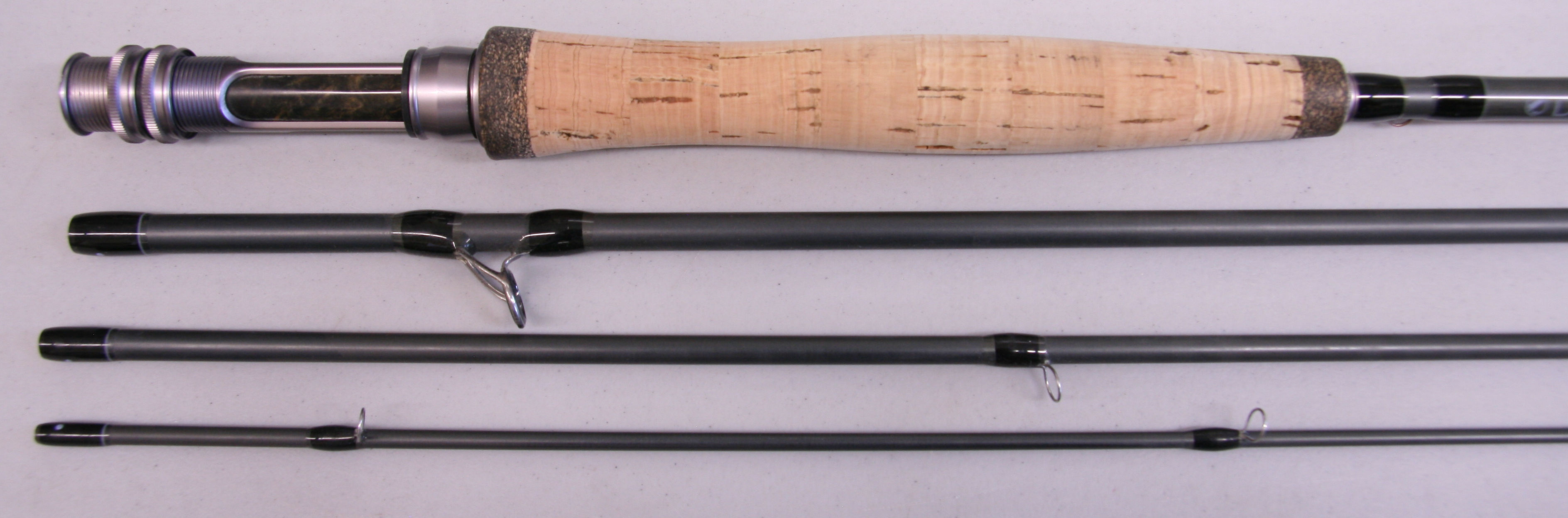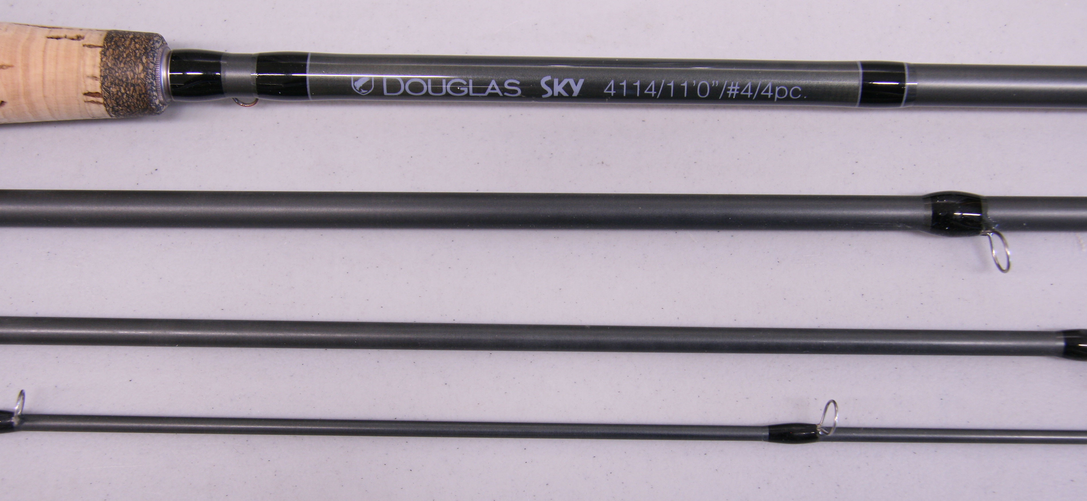 Douglas SKY Model 4114. 11' 5 piece. Line weight 4. Reverse half wells cork grip. Up-locking reel seat over graphite insert. Very good condition.