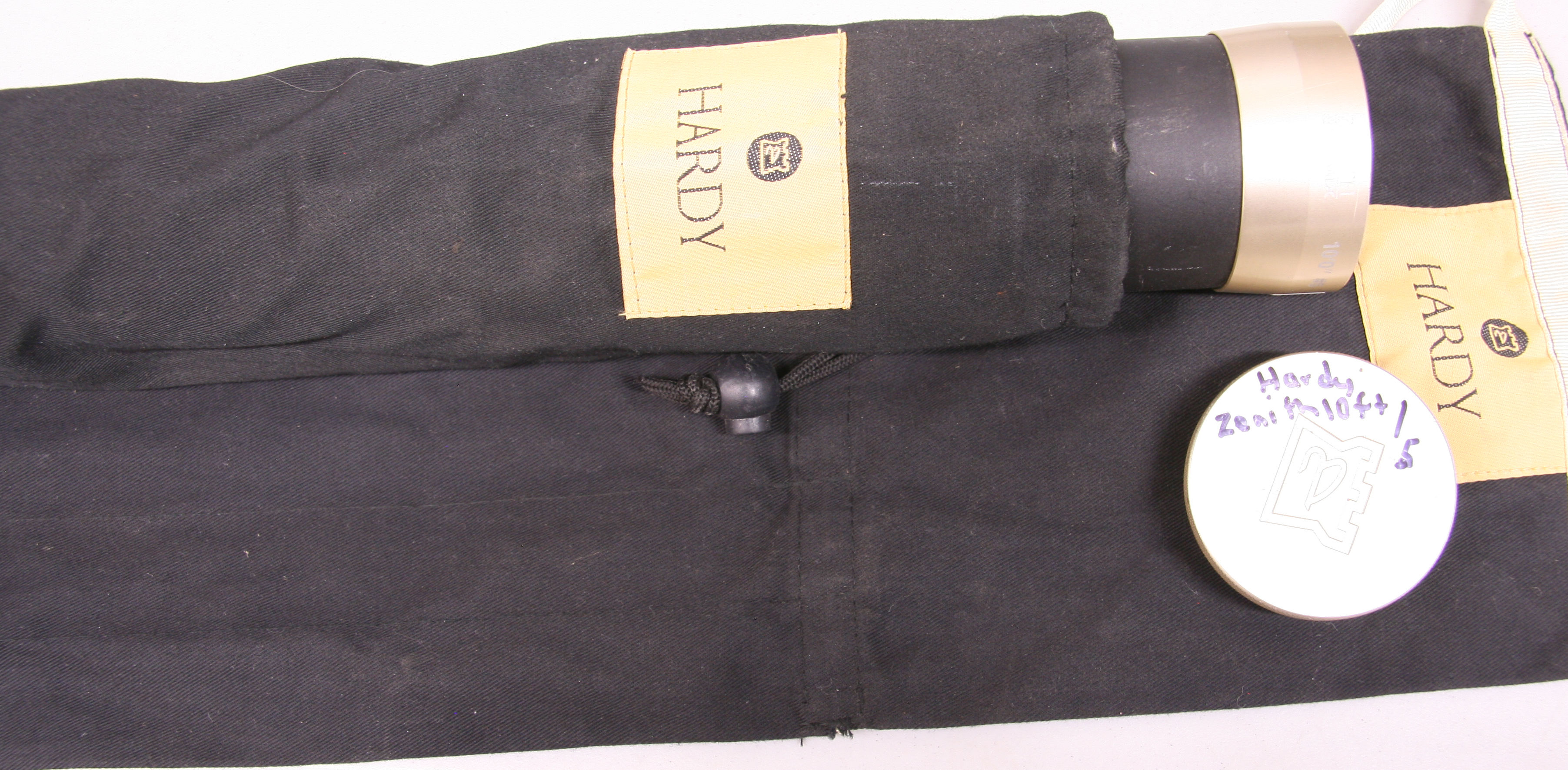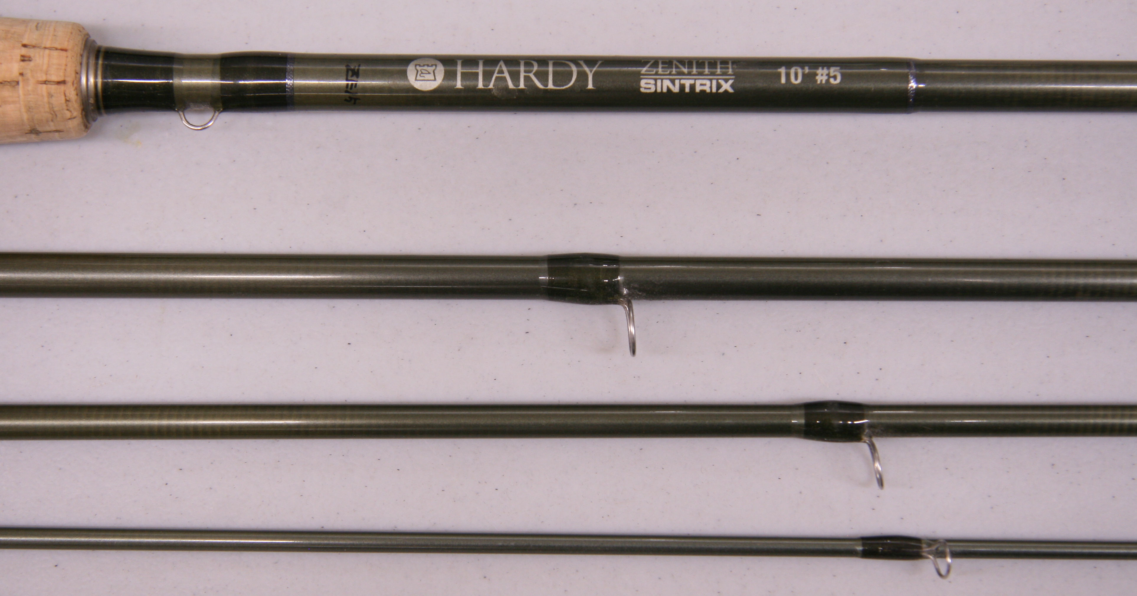 Hardy Zenith Sintrix. Length is 10 feet, 4 piece. Line weight 5.  Reverse half wells cork grip. Up-locking reel seat over wood insert. Includes original bag and tube with cloth tube cover. Very good condition.