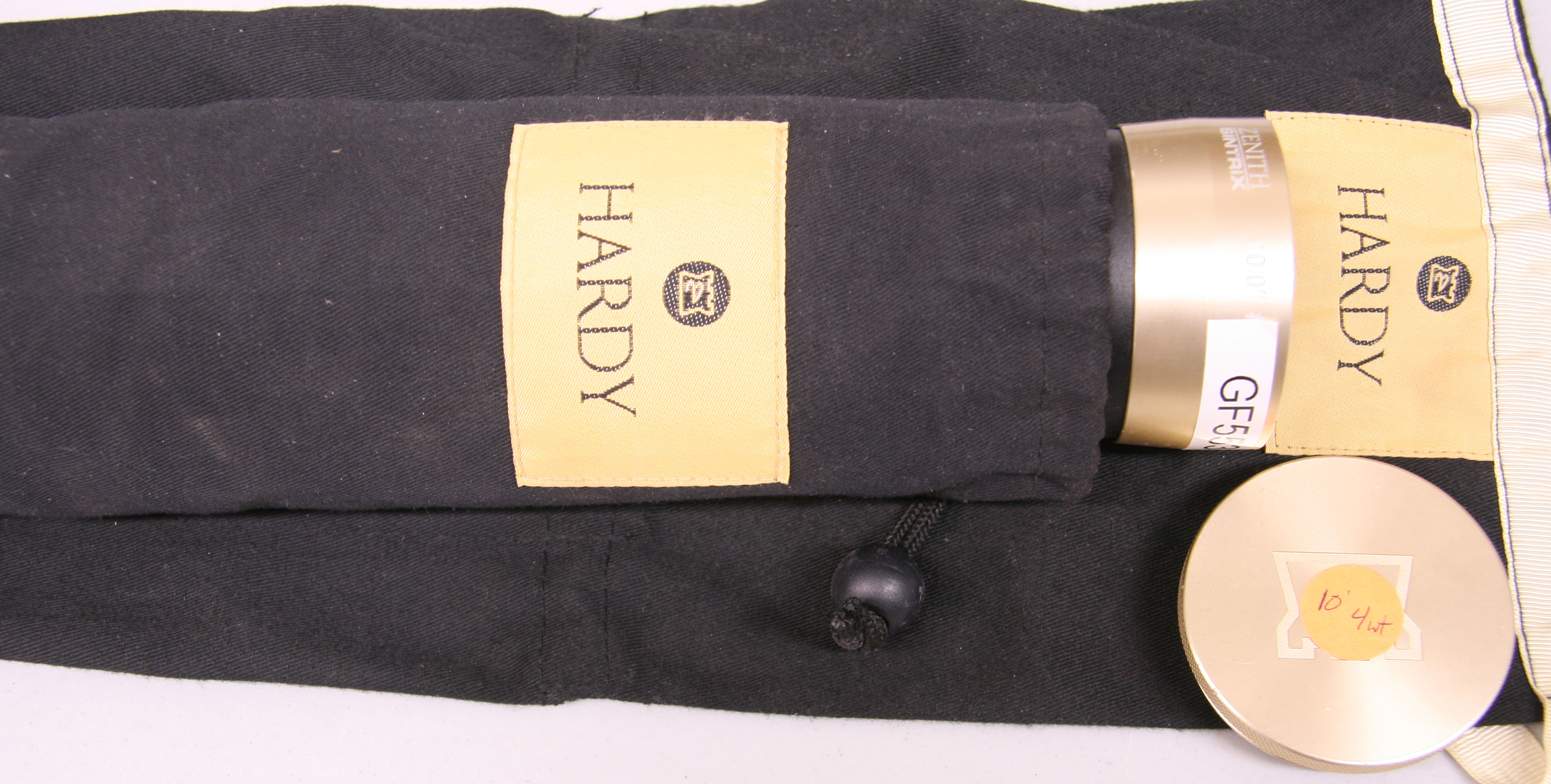 Hardy Zenith Sintrix. Length is 10 feet, 4 piece. Line weight 4.  Reverse half wells cork grip. Up-locking reel seat over wood insert. Includes original bag and tube with cloth tube cover. Very good condition.