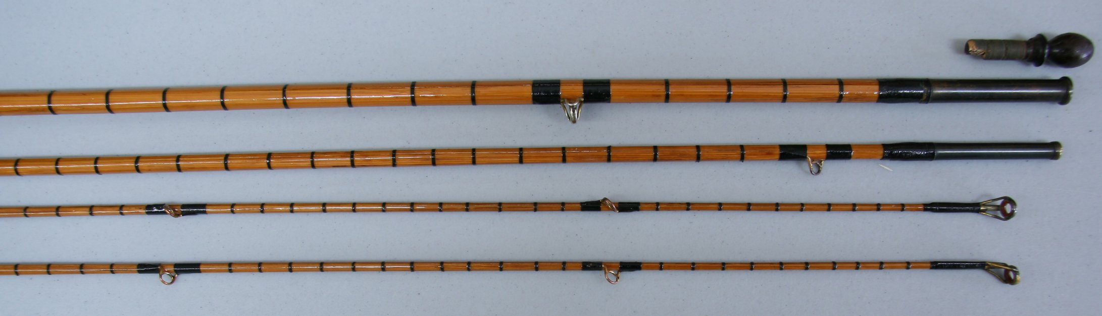 This rod weighs 6 oz. on our digital scale. Line weight 6/7. Cigar cork grip with down-sliding cap and ring over cork reel seat. Black thread wraps with full intermediates. White agate stripper guide and tip tops. Includes butt ferrule plug, original cloth bag and replacement aluminum tube. The condition is excellent restored. Made in Alnwick England.
