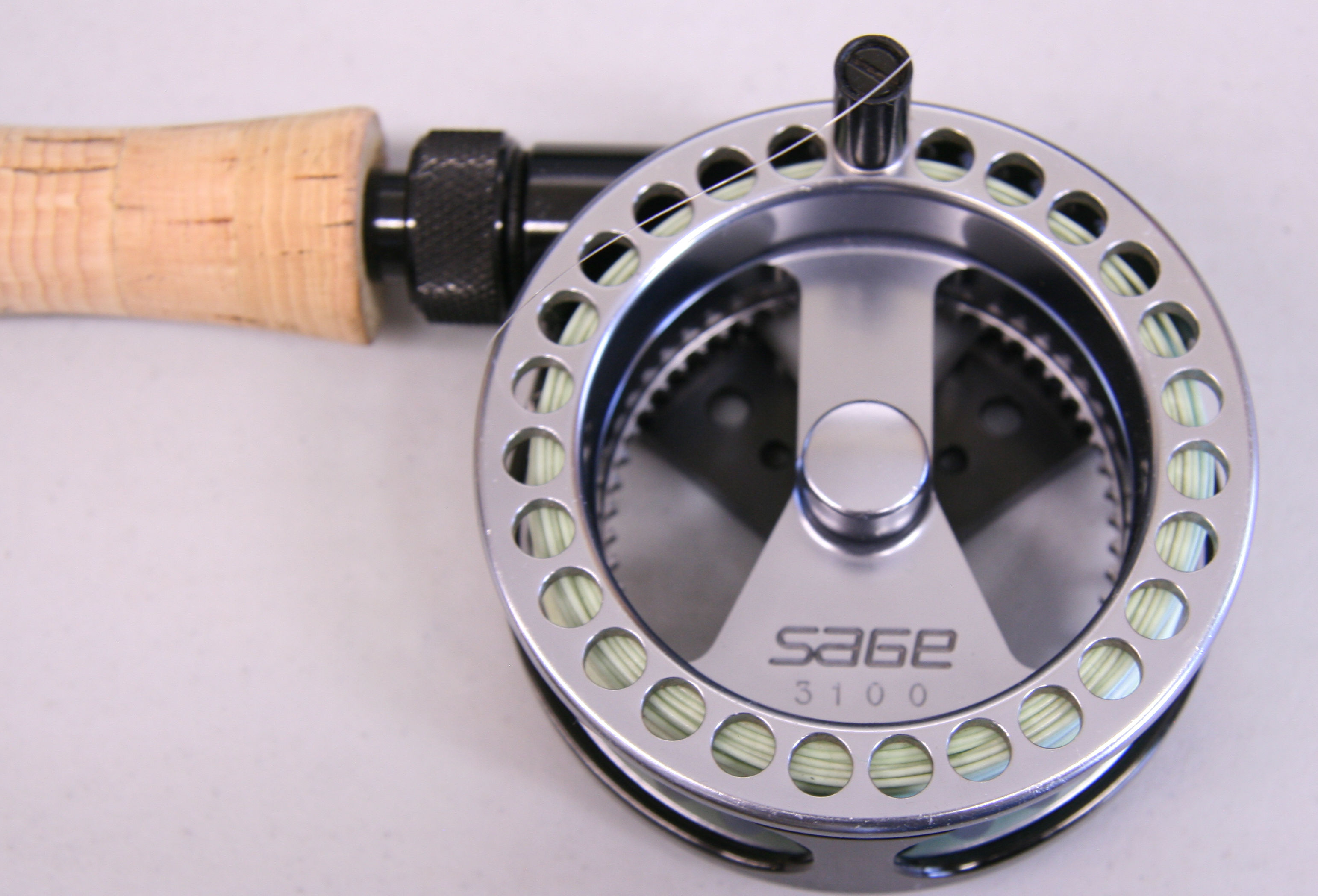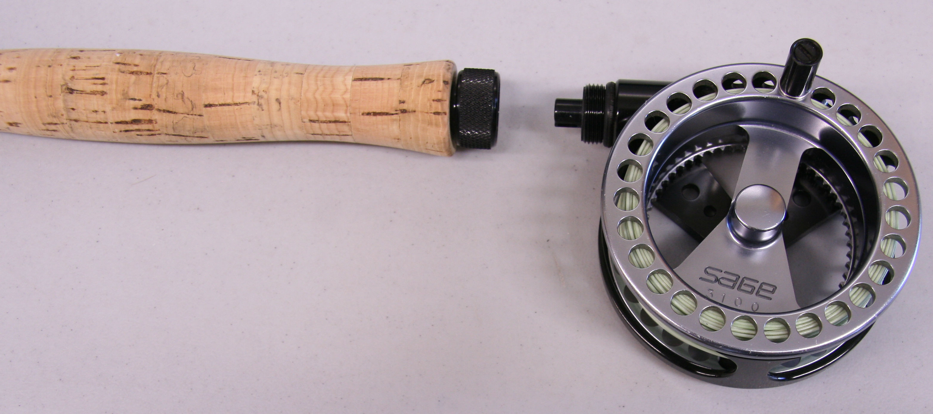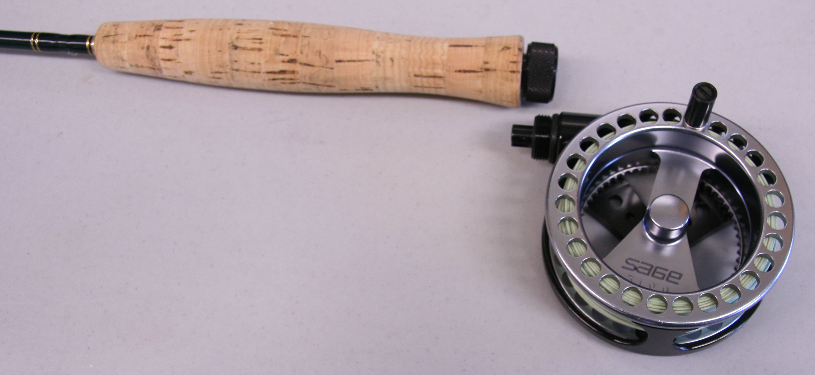 Sage SPL Center Axis. 8'1" 3 piece rod.  Graphite IV. Number 1 line weight. Reverse half wells cork grip. The rod weighs 1 13/16th ozs. Attached to the rod is a Sage 3100 reel with line. Set up for left hand wind. Includes original case that holds the rod and reel. The overall condition of the rod is very good. The reel is sound mechanically with some minor finish rubs.